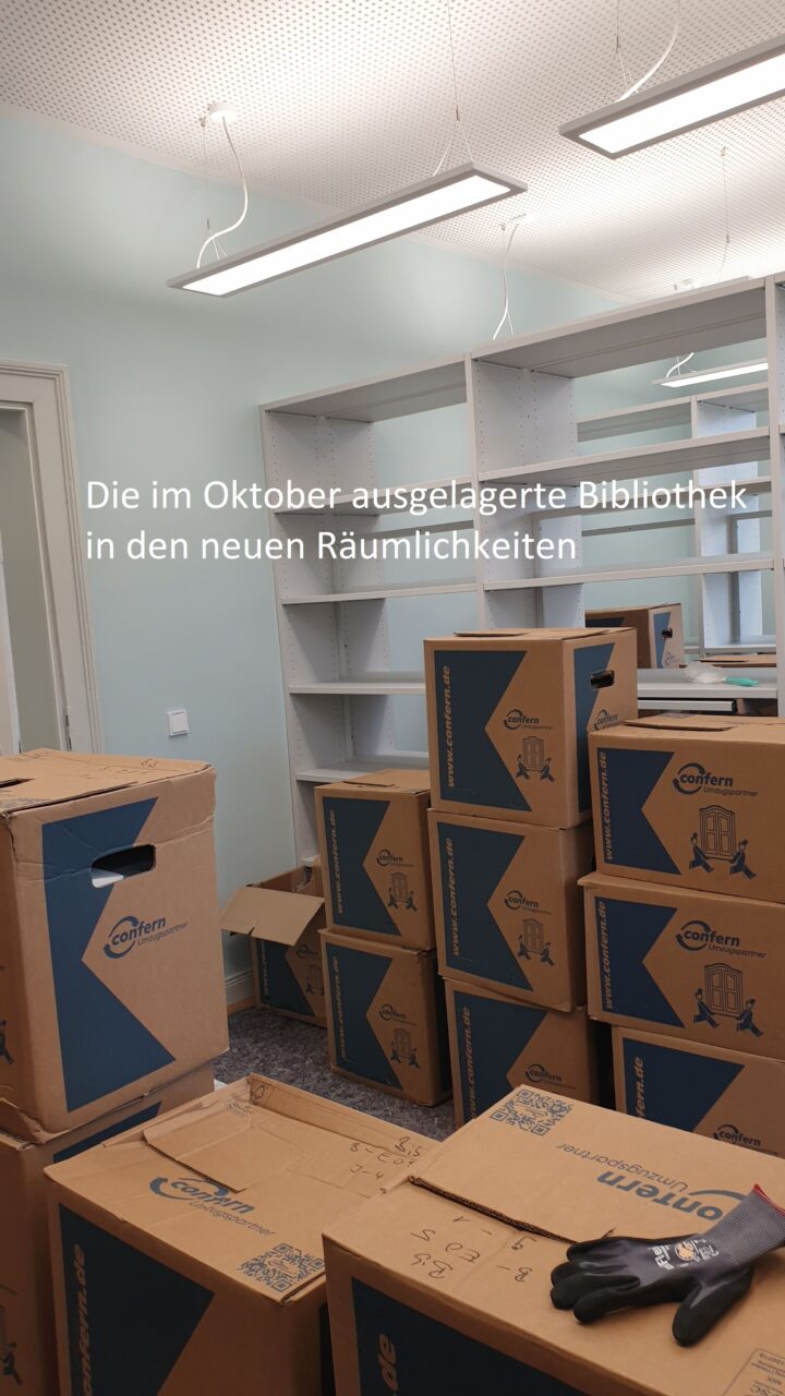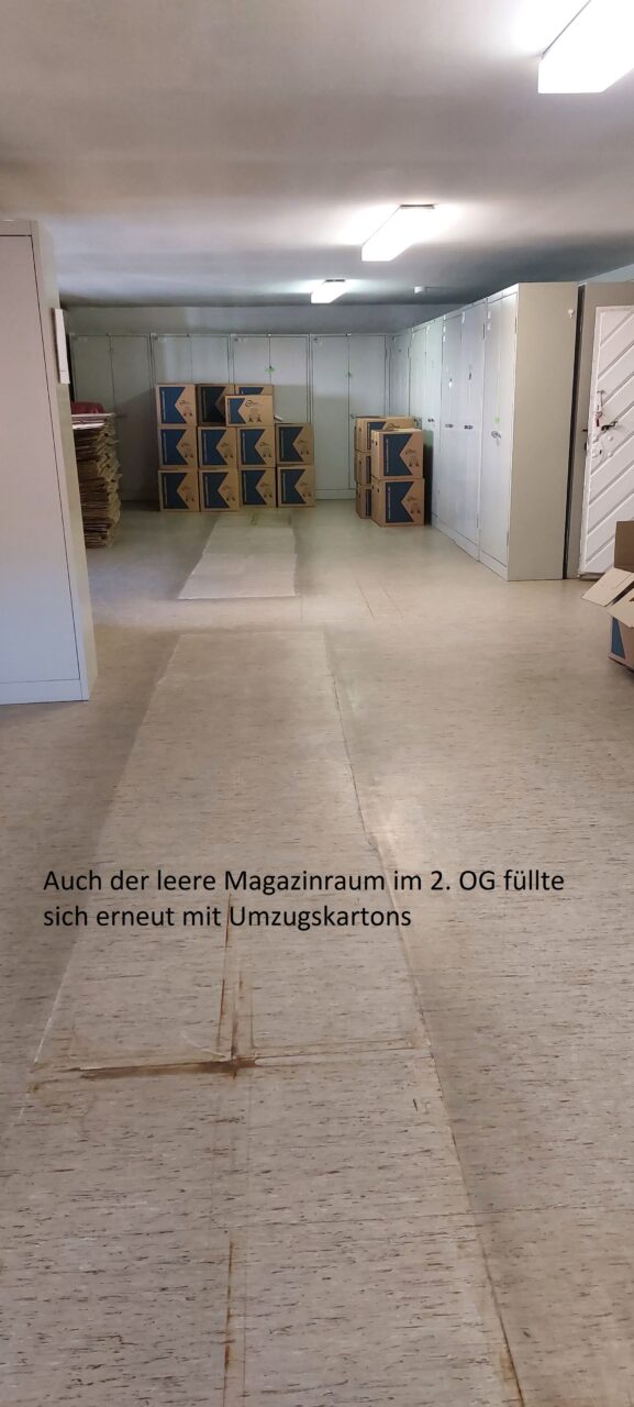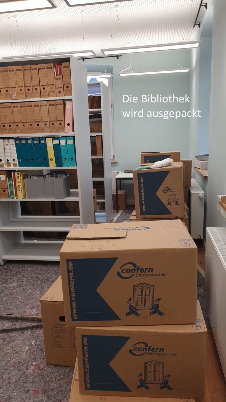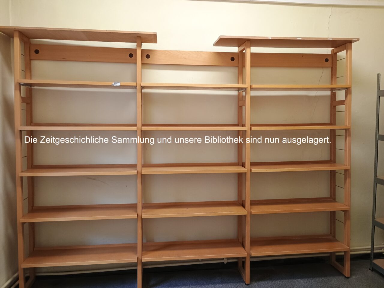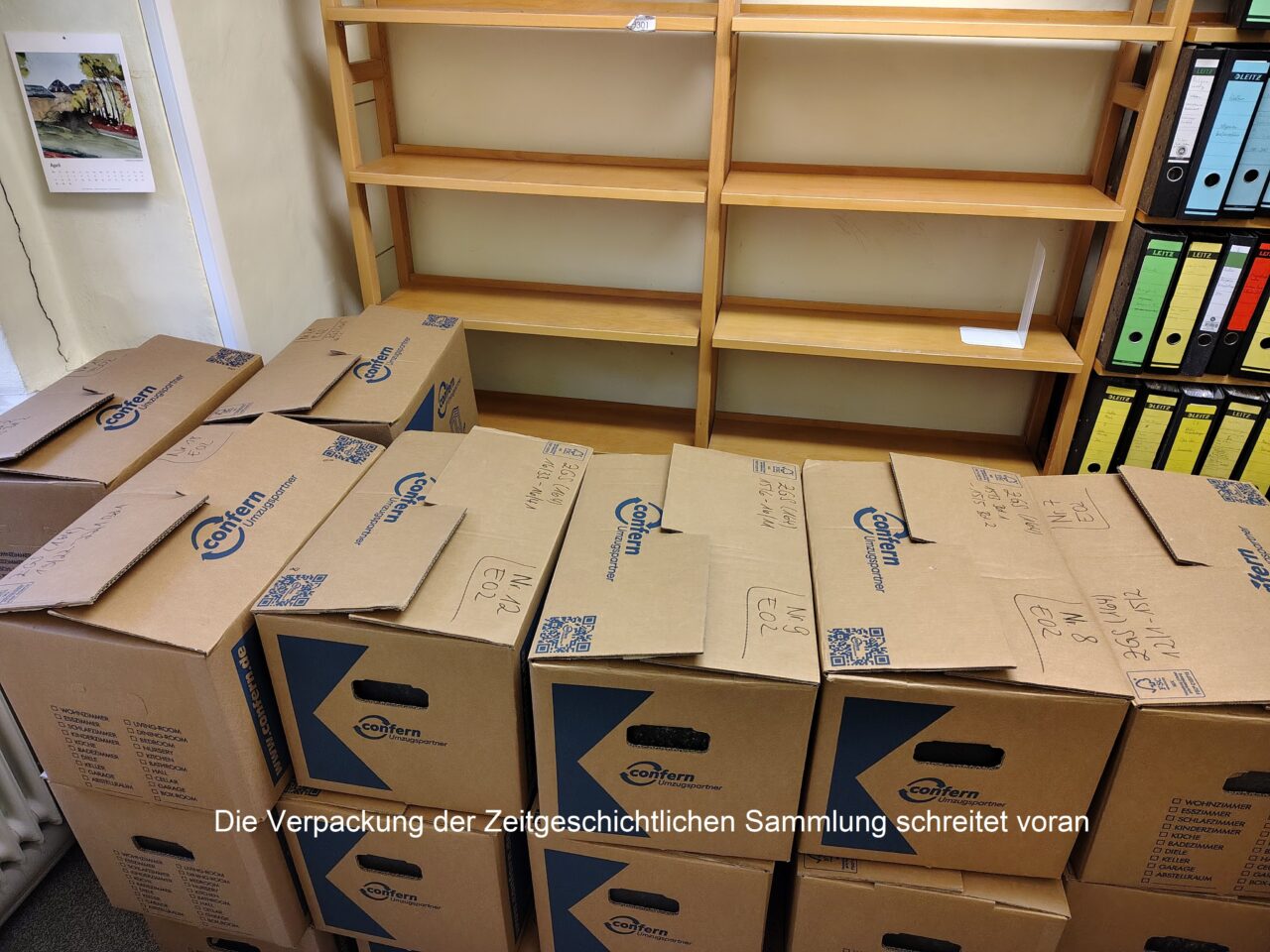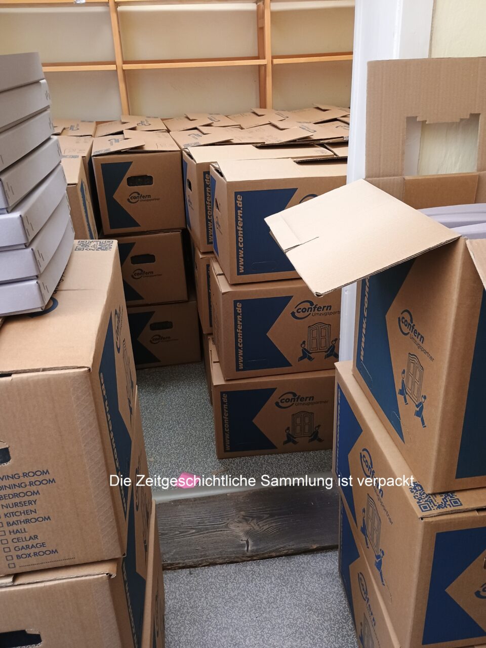 Das bedeutet: Die komplette Bibliothek sowie die Zeitgeschichtliche Sammlung im ersten Obergeschoss wurden verpackt und von unserem Umzugsunternehmen zur Einlagerung abgeholt.