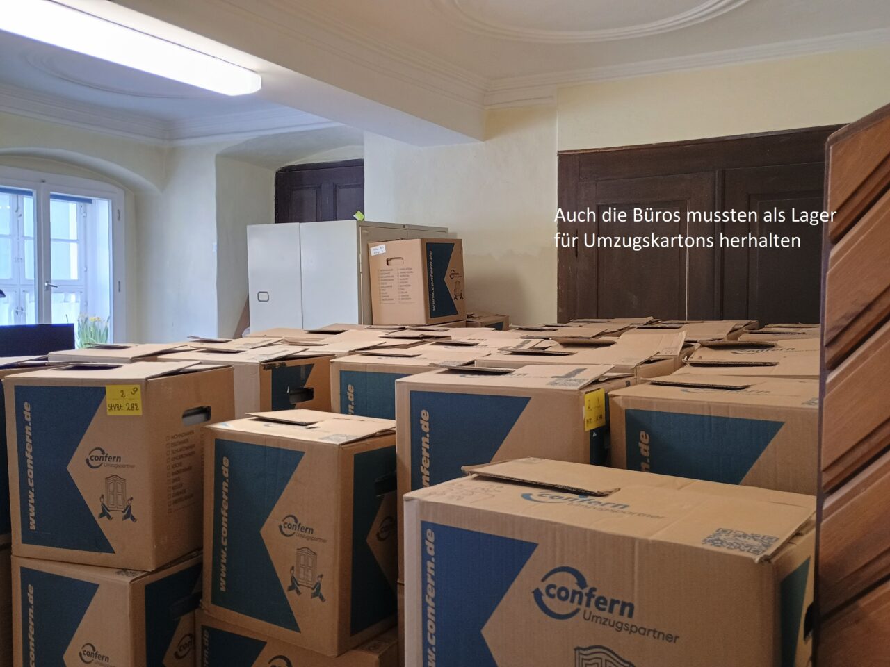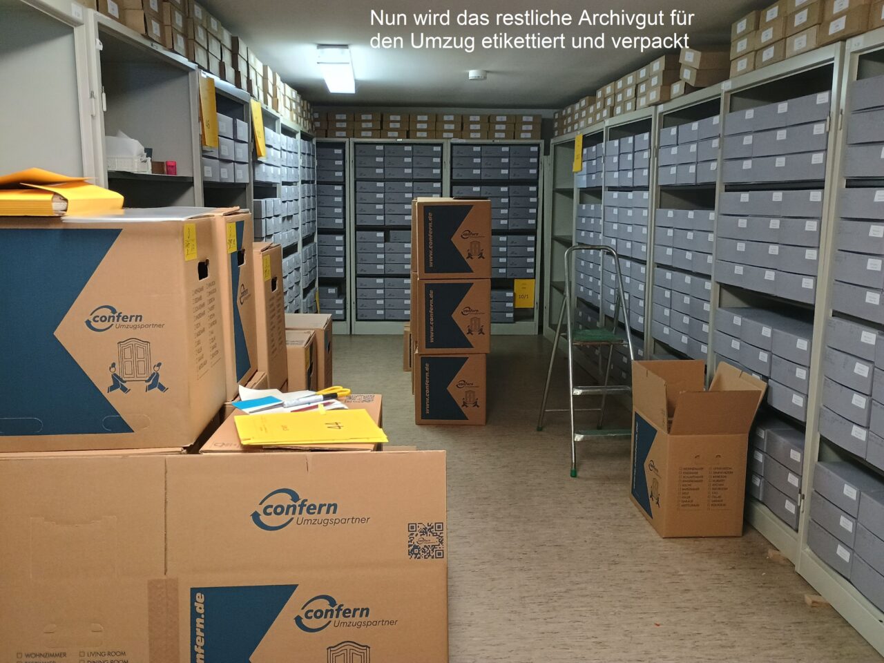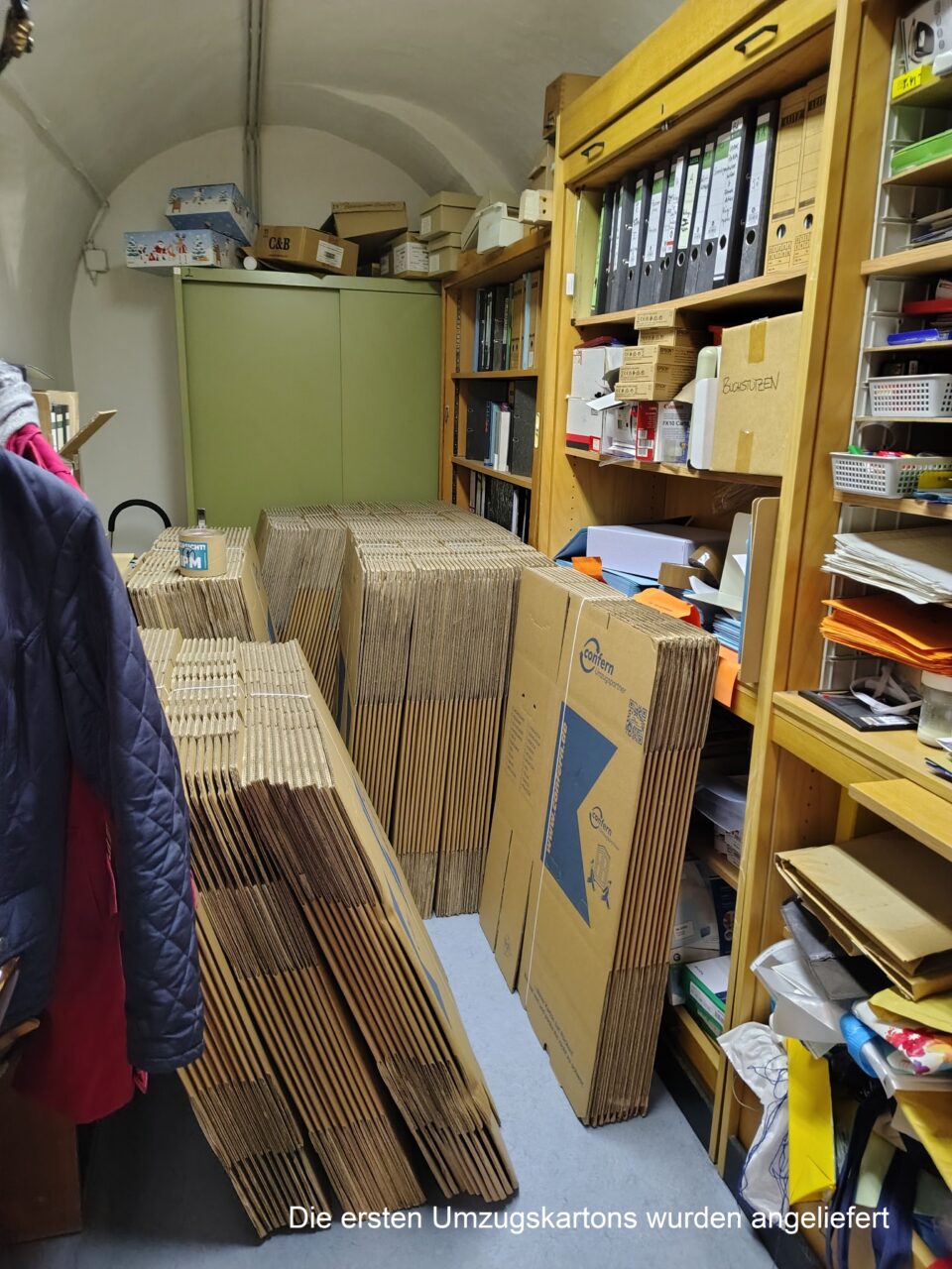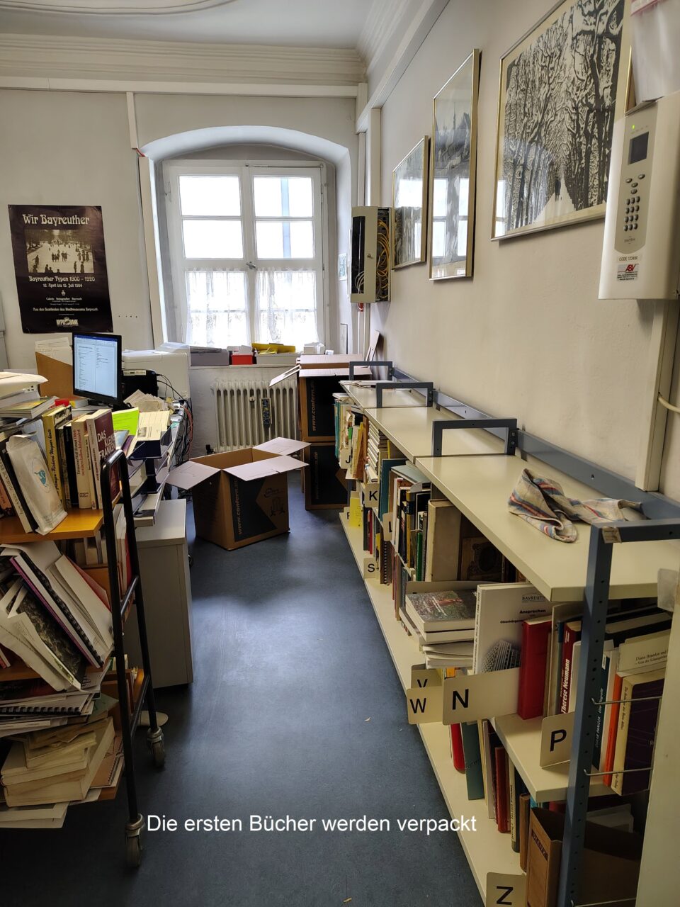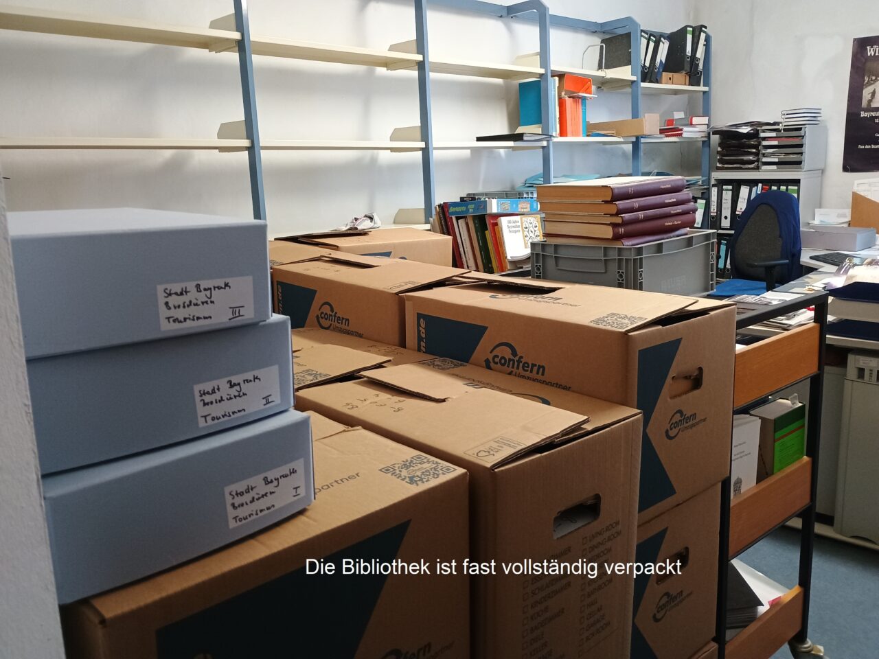 Das bedeutet: Die komplette Bibliothek sowie die Zeitgeschichtliche Sammlung im ersten Obergeschoss wurden verpackt und von unserem Umzugsunternehmen zur Einlagerung abgeholt.