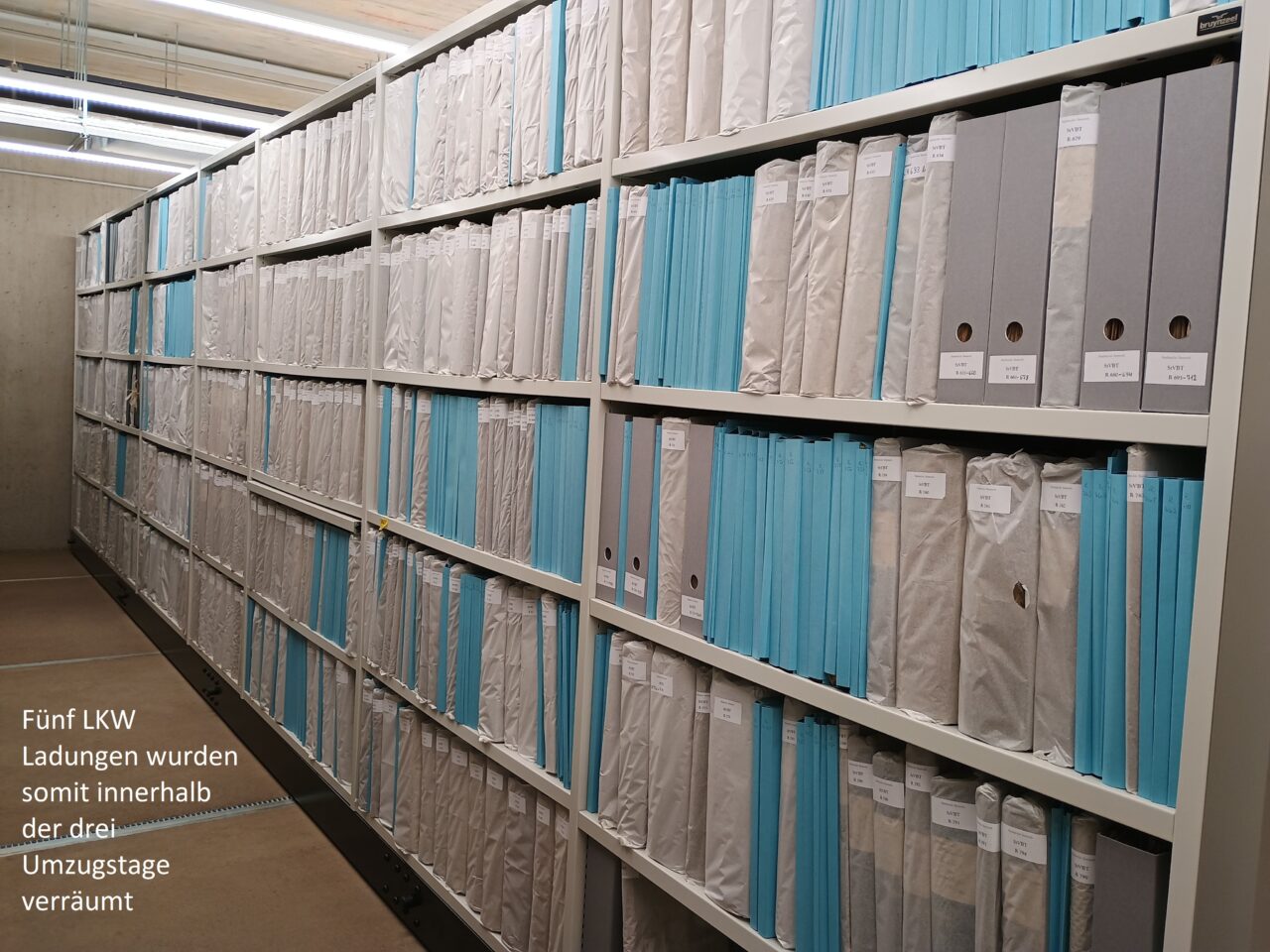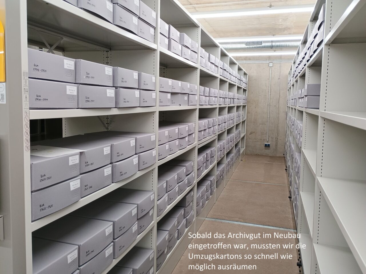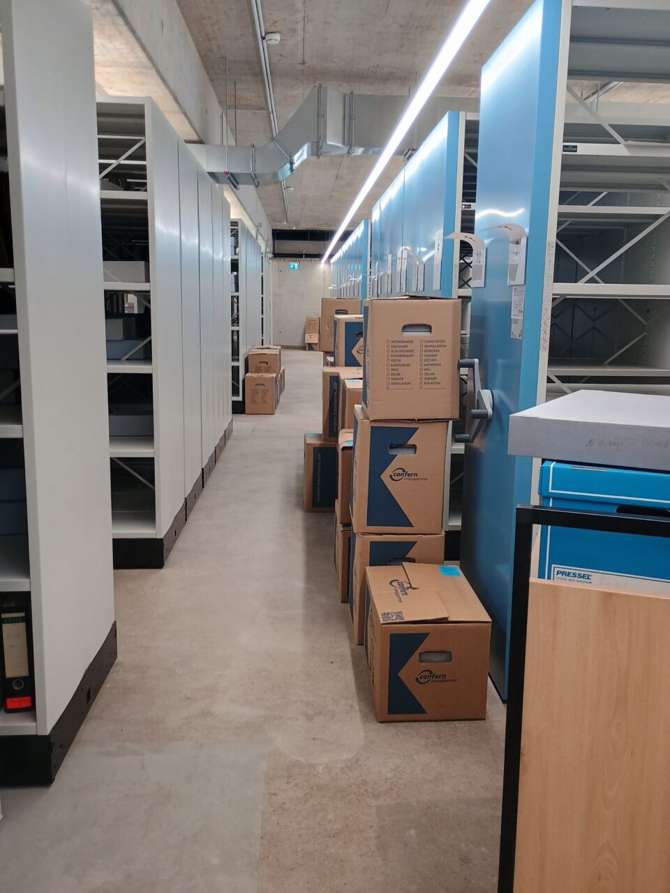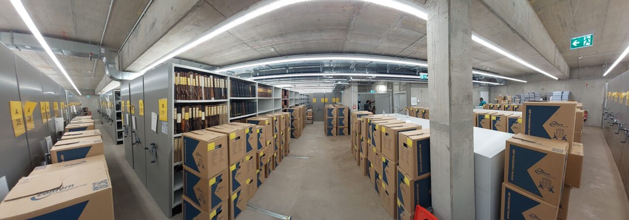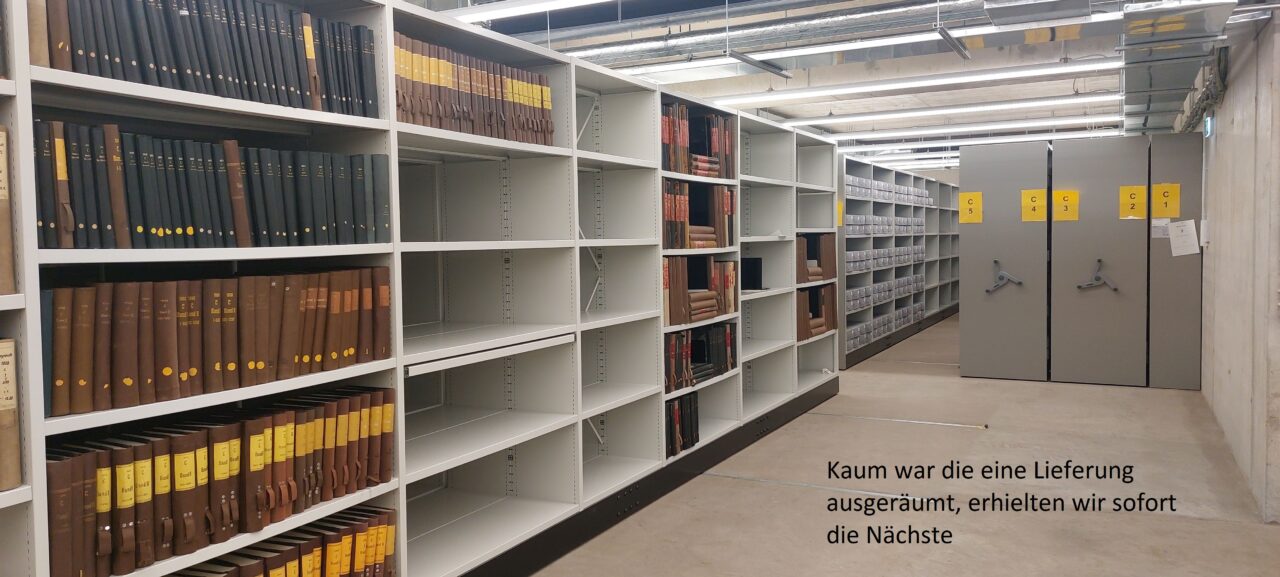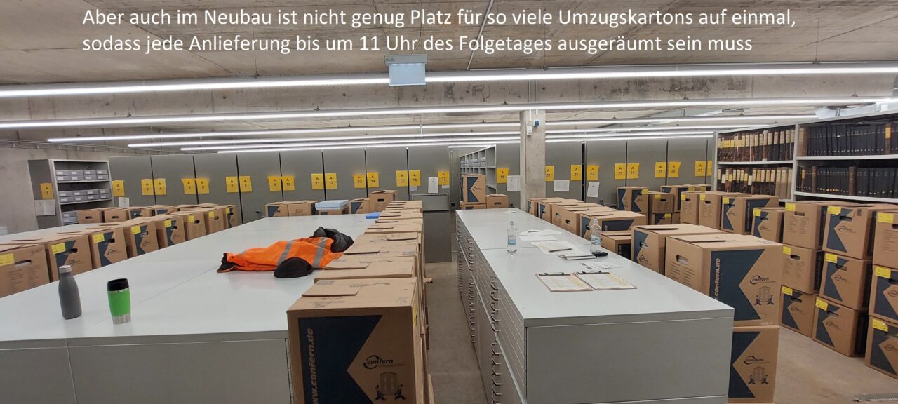 Anschließend konnten alle Magazinblöcke virtuell belegt werden, damit das Auspacken des Archivguts zügig ablaufen kann und wir möglichst bald nach dem Umzug wieder den Normalbetrieb aufnehmen können.