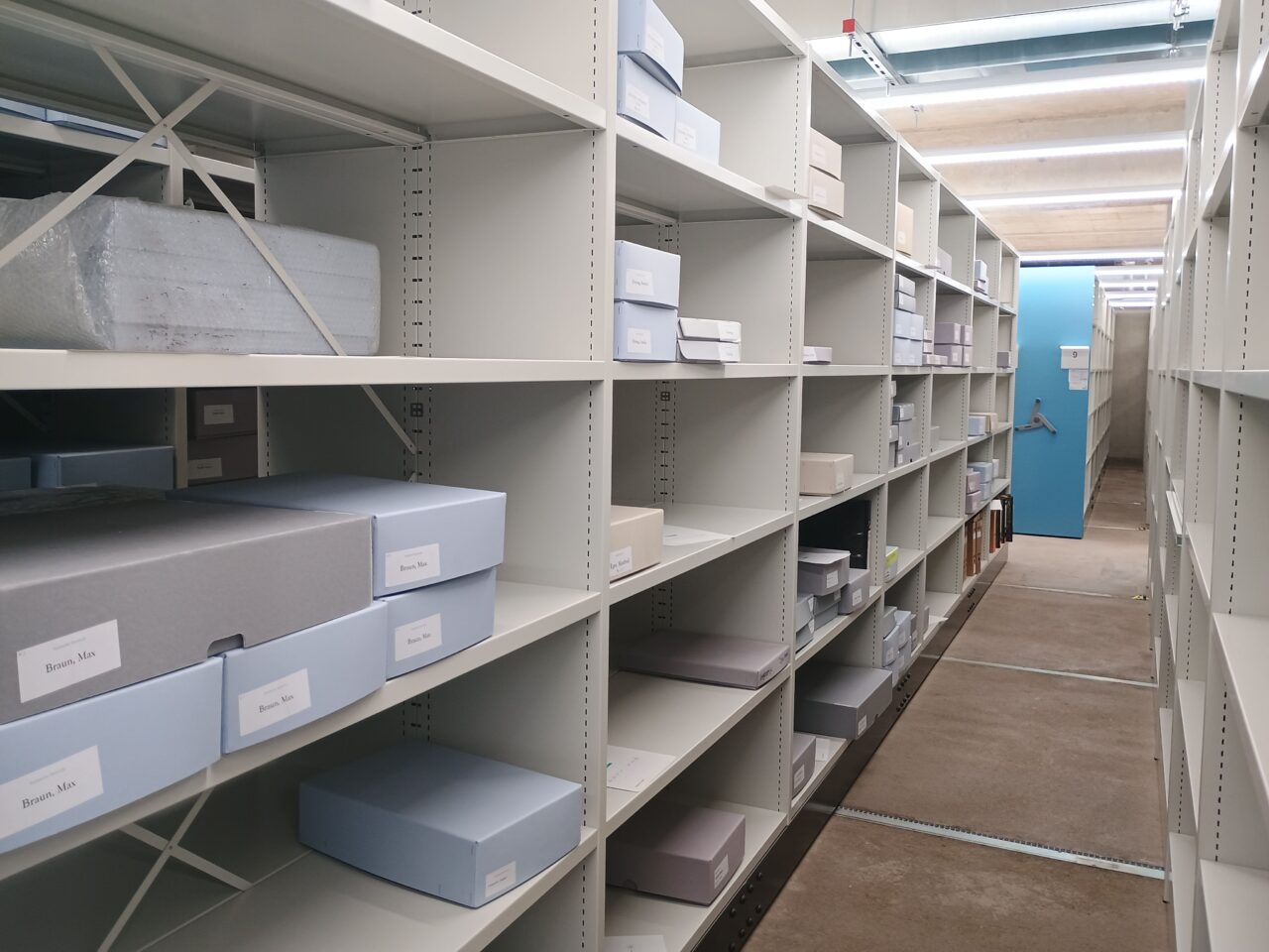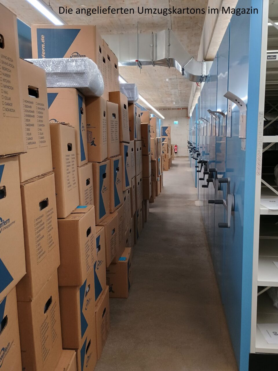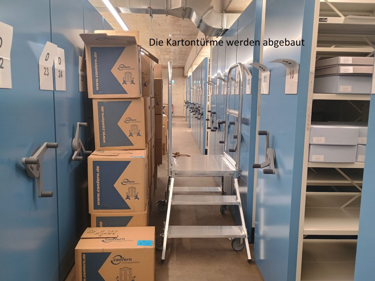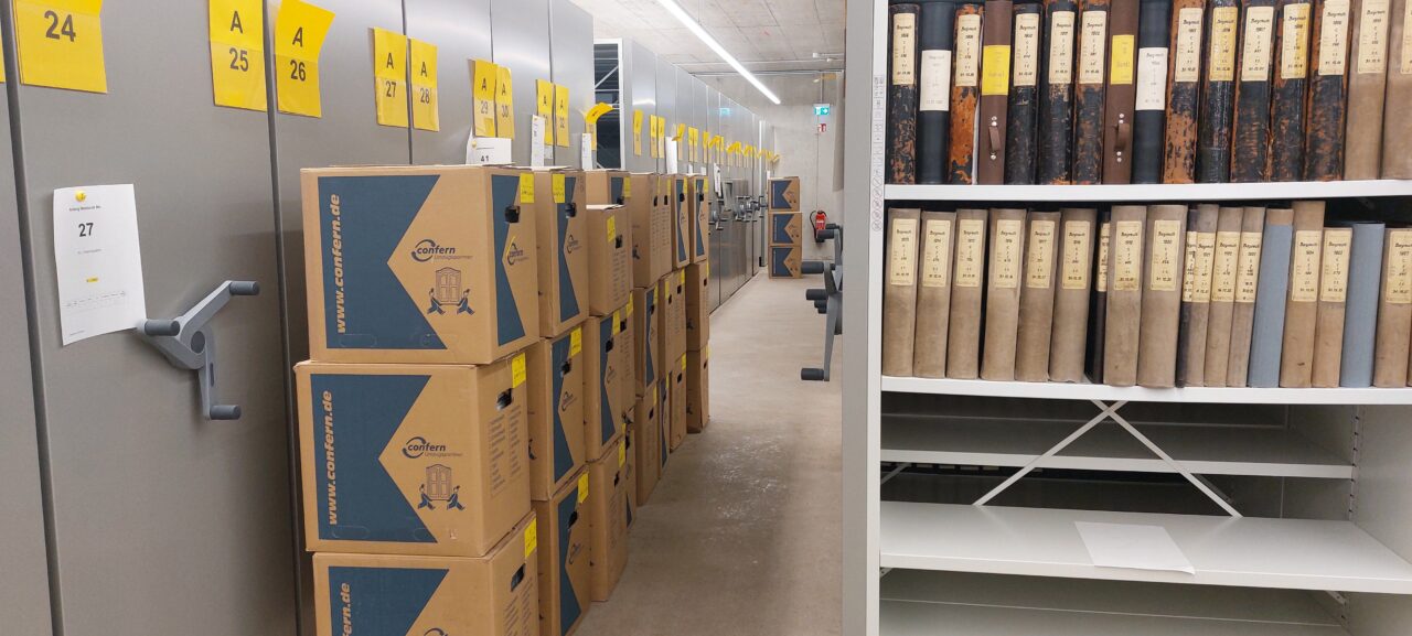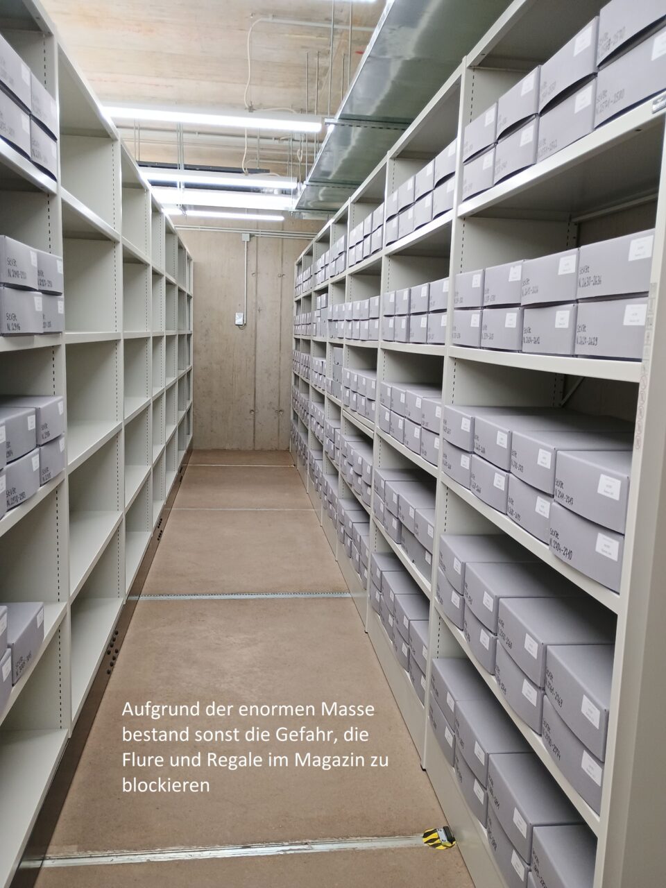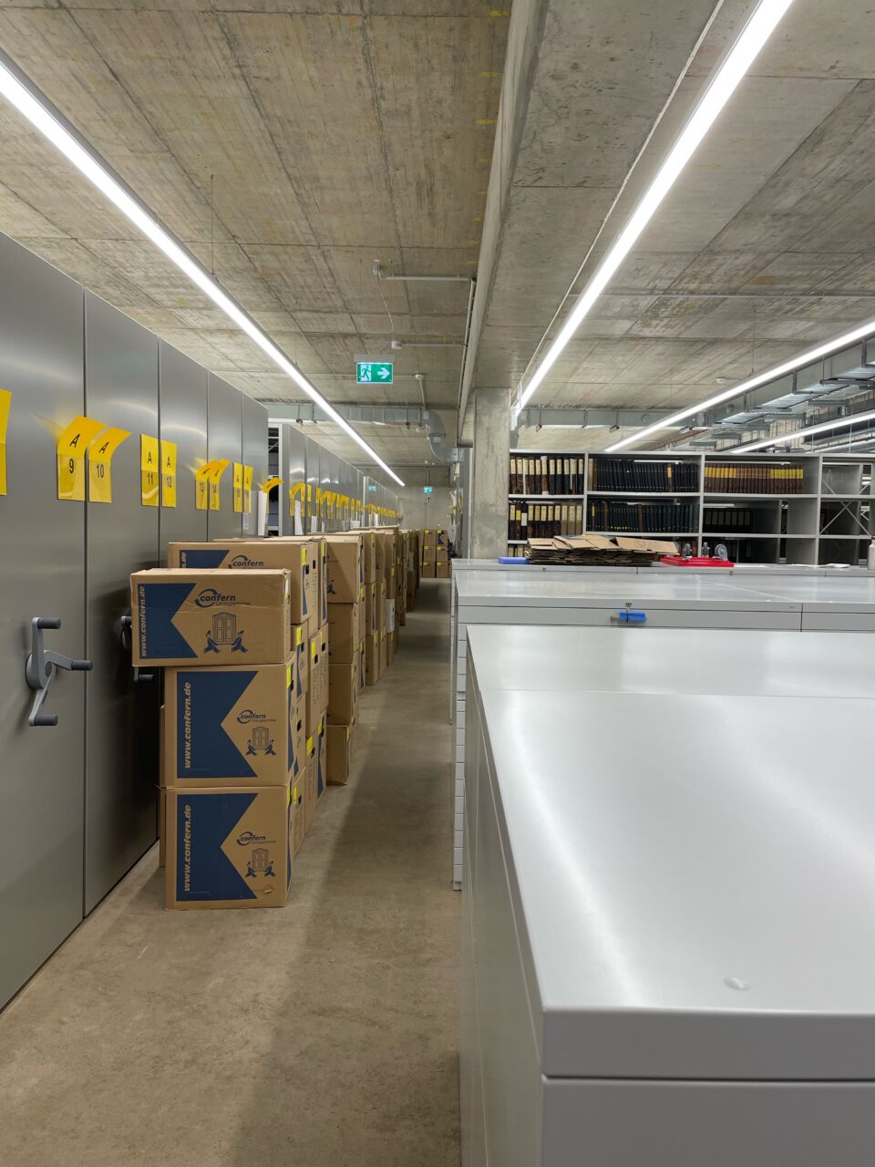 Anschließend konnten alle Magazinblöcke virtuell belegt werden, damit das Auspacken des Archivguts zügig ablaufen kann und wir möglichst bald nach dem Umzug wieder den Normalbetrieb aufnehmen können.