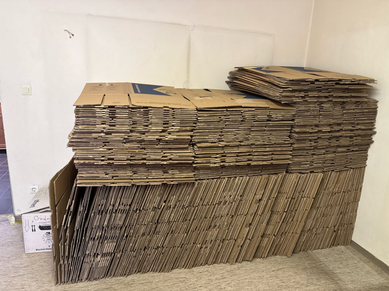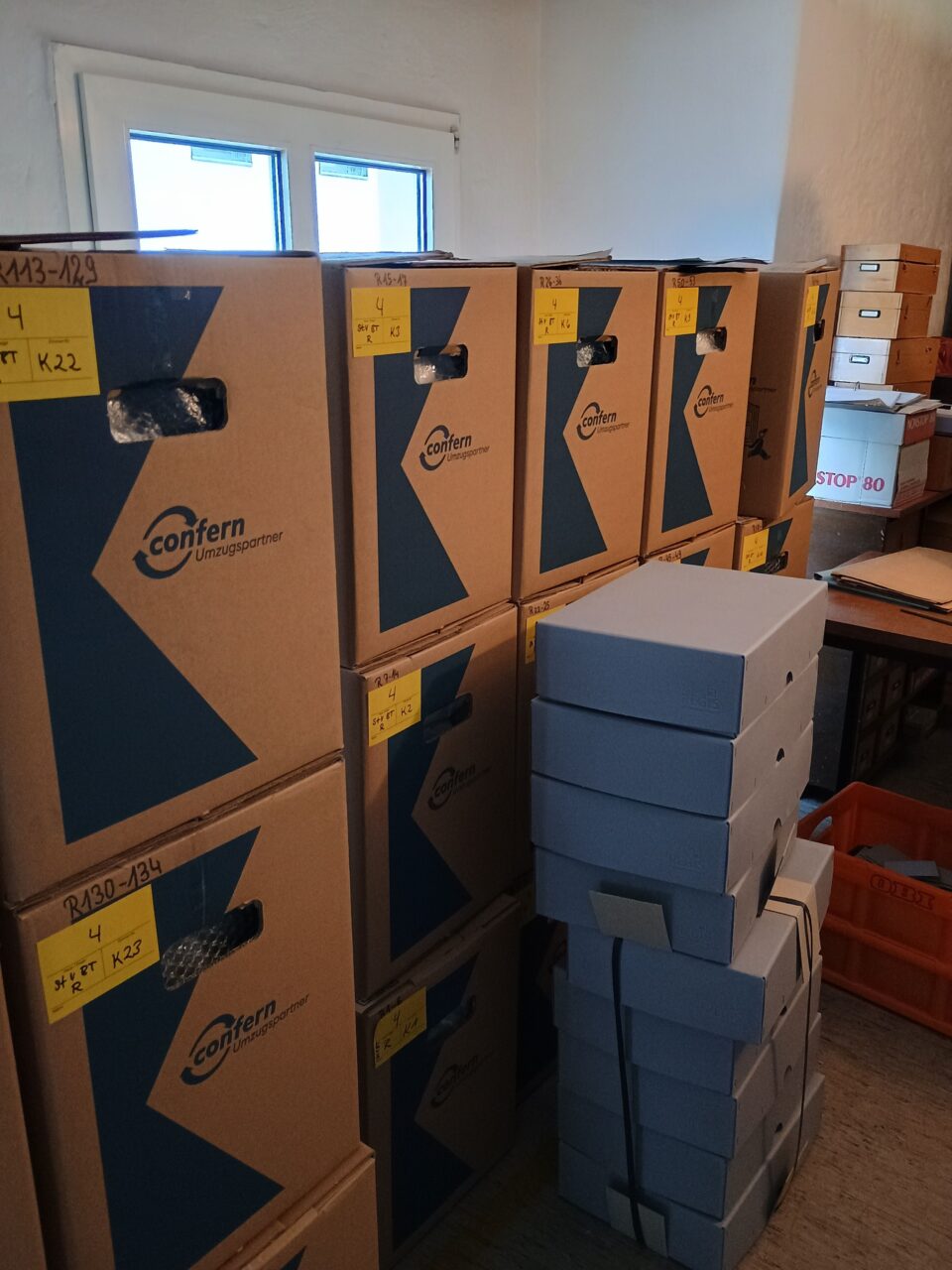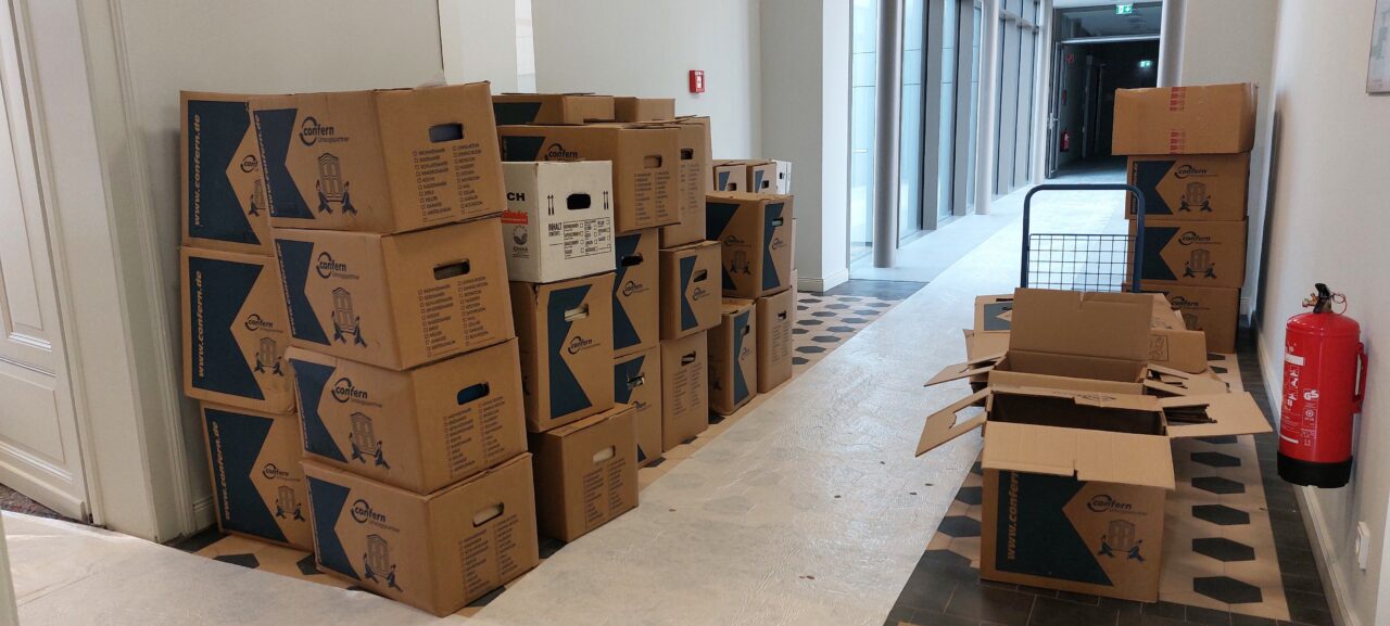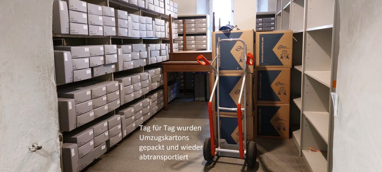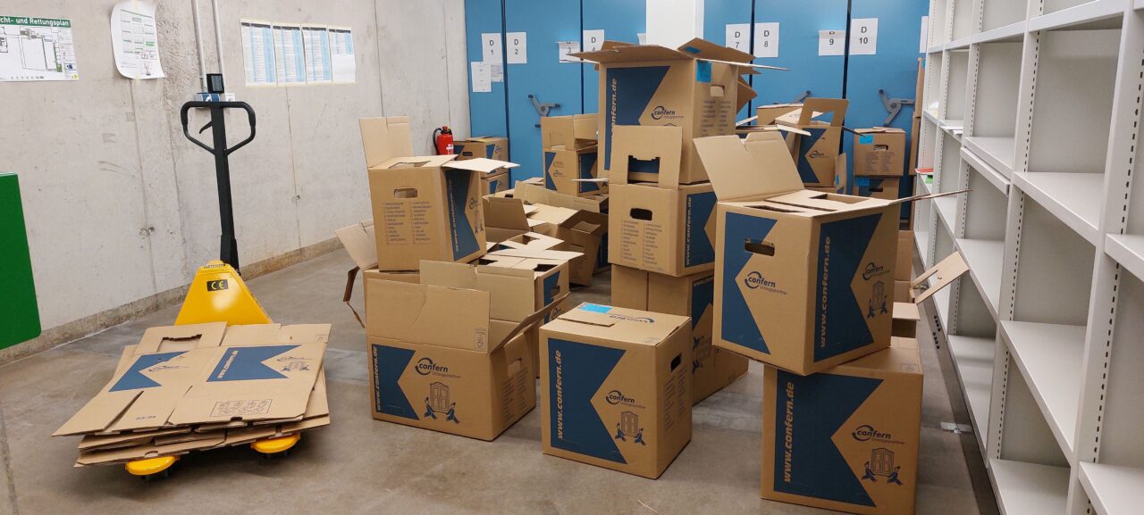 In der letzten Woche ging es weiter mit der Verpackung des Archivguts. Dafür wurden zunächst Montagmorgen weitere 270 Umzugskartons angeliefert. Anschließend wurde das Archivgut aus den Magazinräumen im Erdgeschoss nach und nach verpackt und aus Platzgründen im Lesesaal gestapelt. Auch die historischen Karteien wurden aus den Karteikartenschränken herausgenommen und erst in Archivboxen, dann in Umzugskisten verpackt.