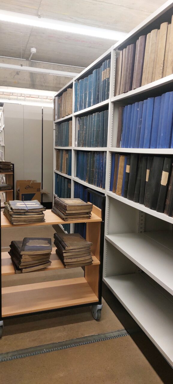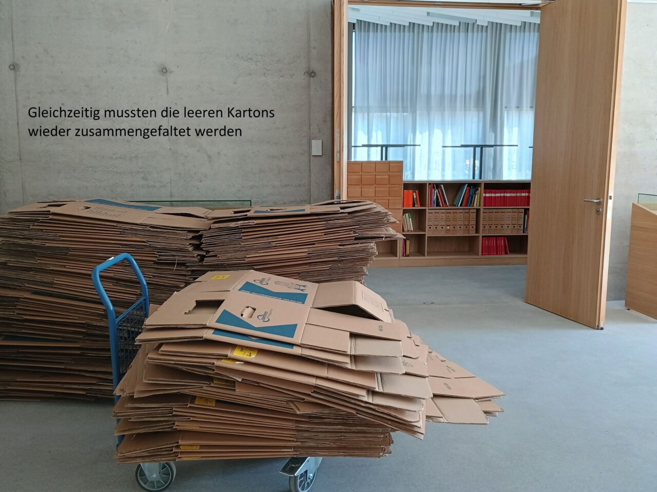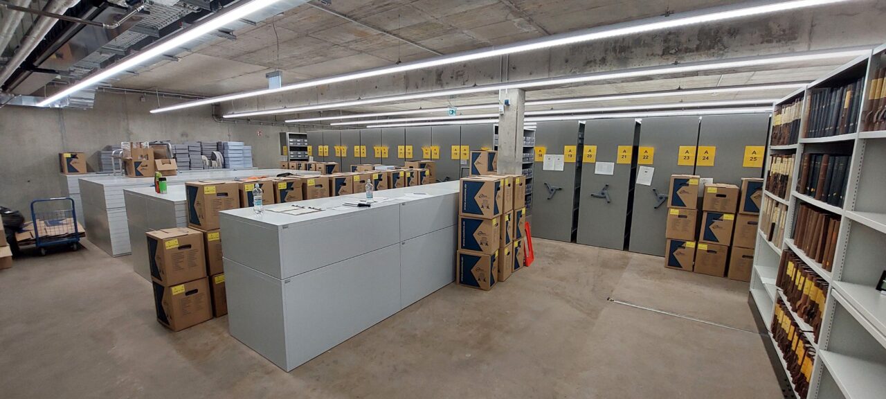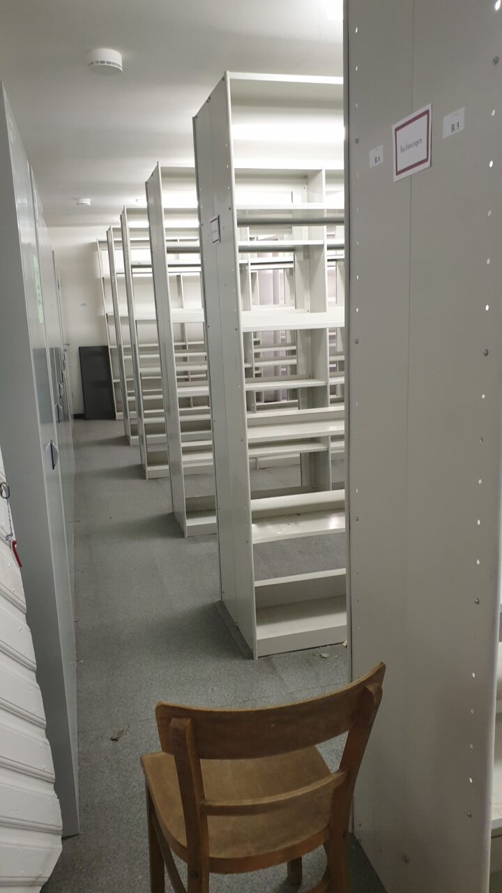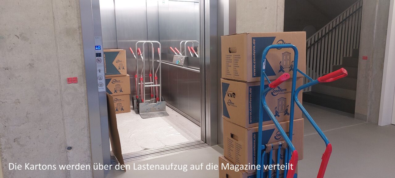 In den darauffolgenden Wochen teilte sich unser Team auf die beiden Standorte auf. Der eine Teil packte am Neubau die Bibliothek, die Zeitgeschichtliche Sammlung sowie einige Archivalien in die dafür vorgesehenen Magazine und Büros. Das andere Team packte weiter Kartons am alten Standort. Weiterhin laufen die Vorbereitungen für den Umzug des Archivguts, der in der Woche vom 23. bis 27. in die nächste Runde geht.