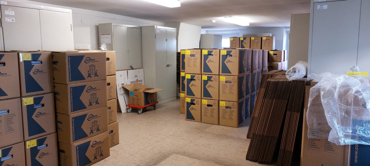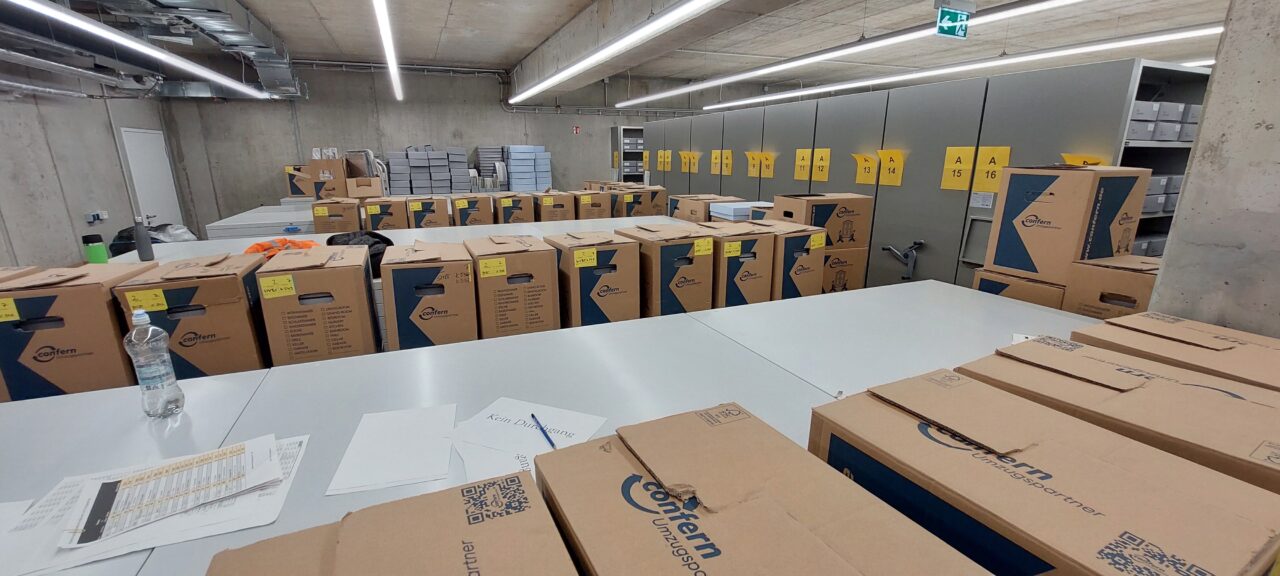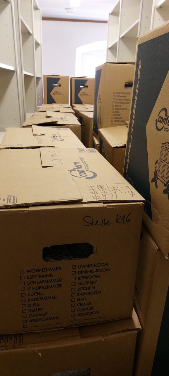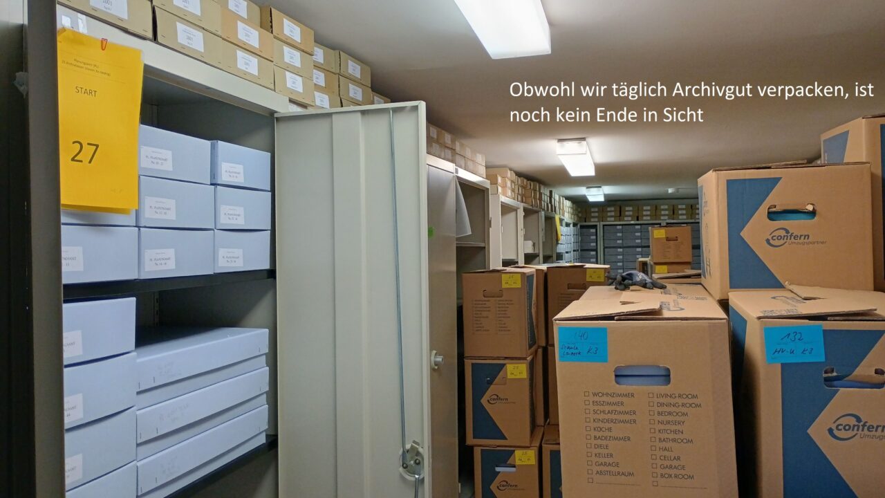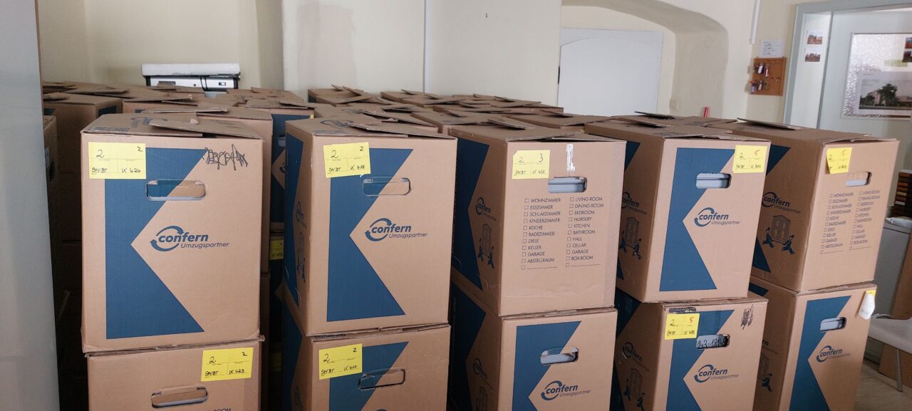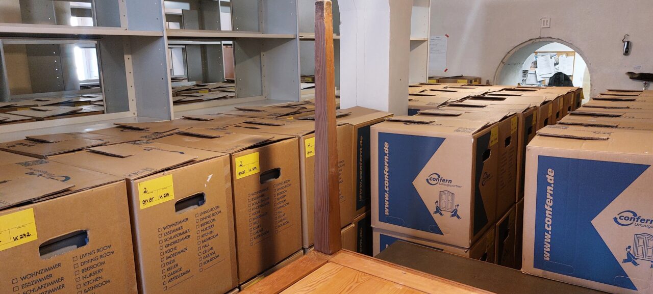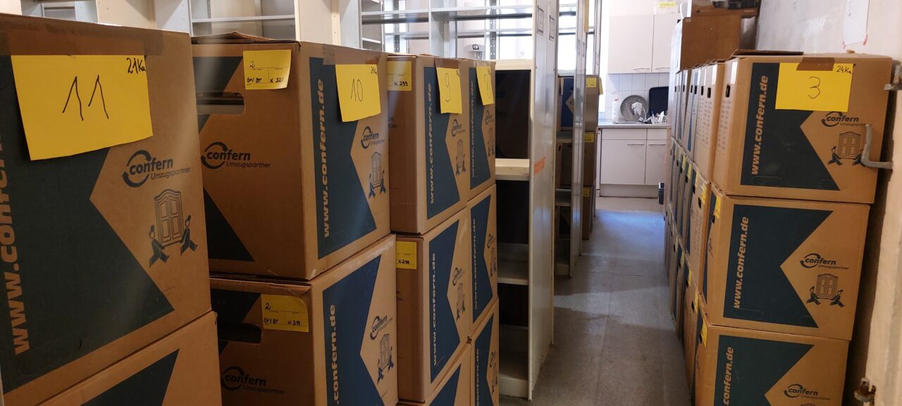 In den nächsten Wochen werden die letzten Großformate und Büromaterialien aus dem ehemaligen Archiv verpackt und transportiert. Außerdem findet das Archivgut aus unserem Außenlager endlich seinen Weg zurück in die dafür vorgesehenen Magazine.