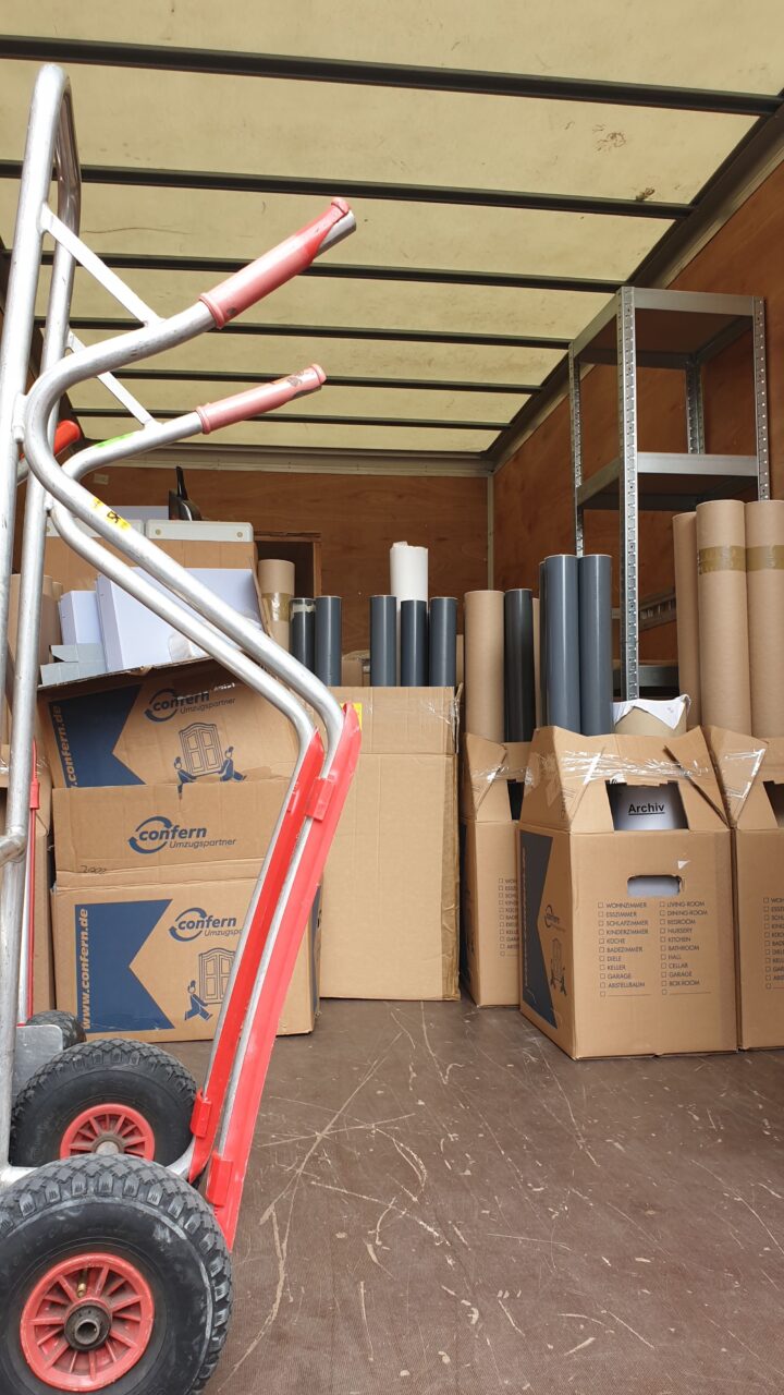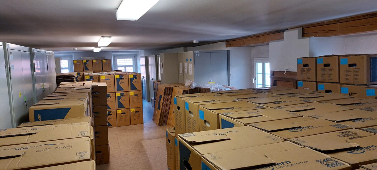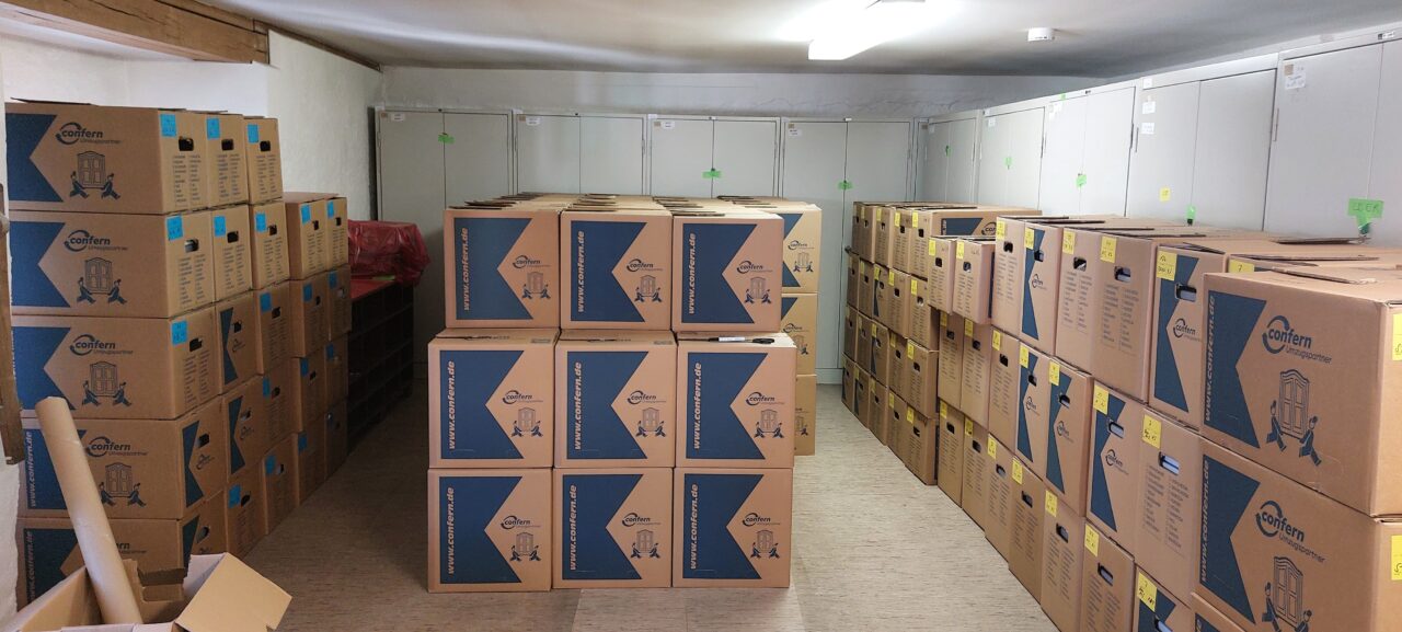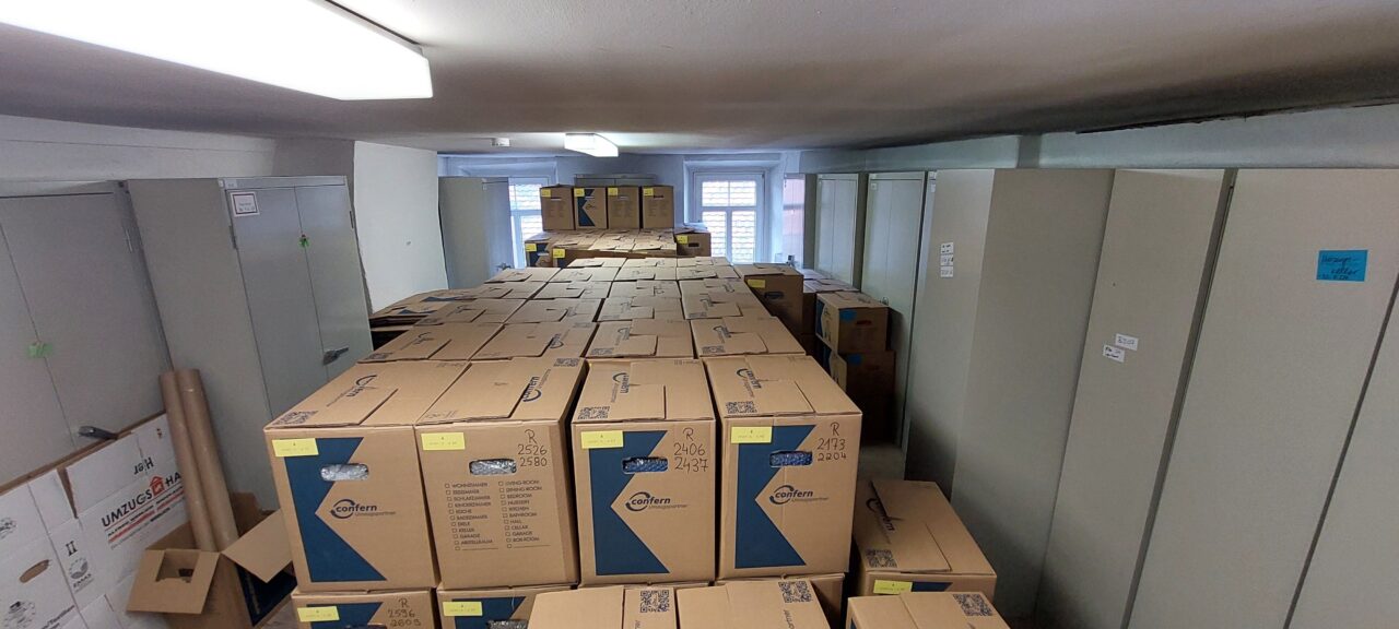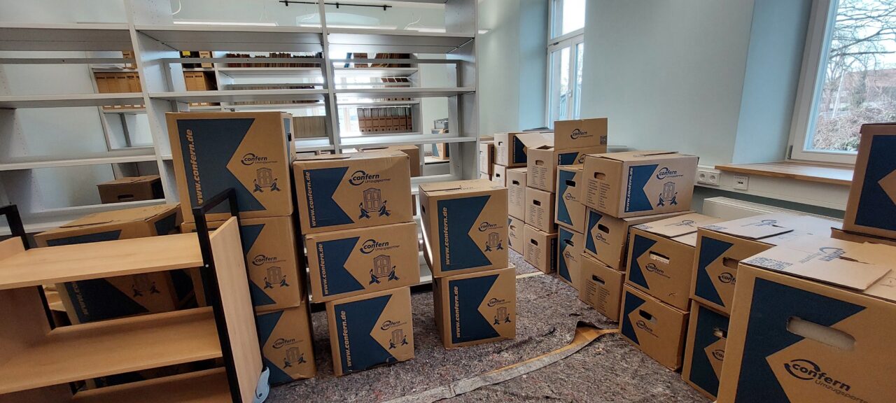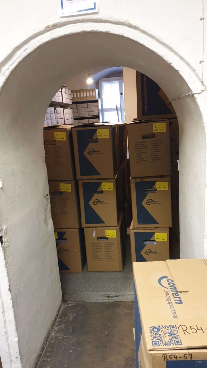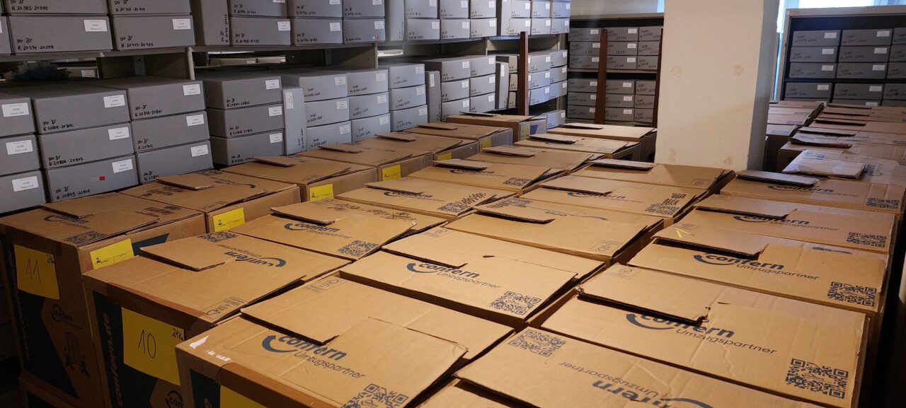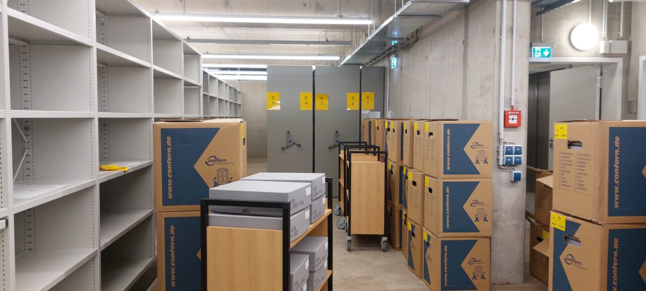 In den nächsten Wochen werden die letzten Großformate und Büromaterialien aus dem ehemaligen Archiv verpackt und transportiert. Außerdem findet das Archivgut aus unserem Außenlager endlich seinen Weg zurück in die dafür vorgesehenen Magazine.