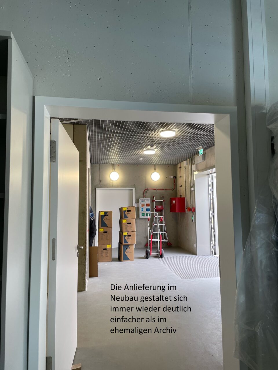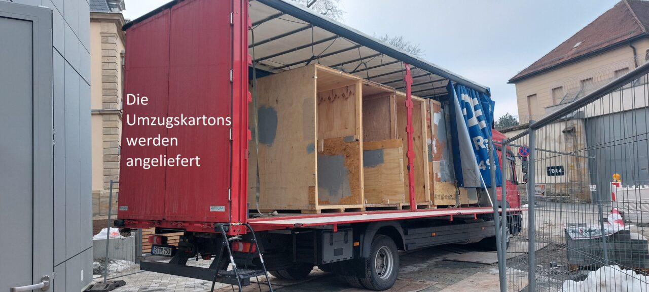 Anschließend konnten die letzten Vorbereitungen für die erste Anlieferung der Umzugsfirma abgeschlossen werden. Dafür mussten alle Regale mit Schildern versehen werden. Unsere Pläne, wo welcher Karton später stehen wird, wurden angebracht und die Böden mit Vlies geschützt. Am 10.02. um 7:30 empfingen wir die Umzugsfirma und begannen die im Oktober ausgelagerten Umzugskisten in den Neubau zu bringen.