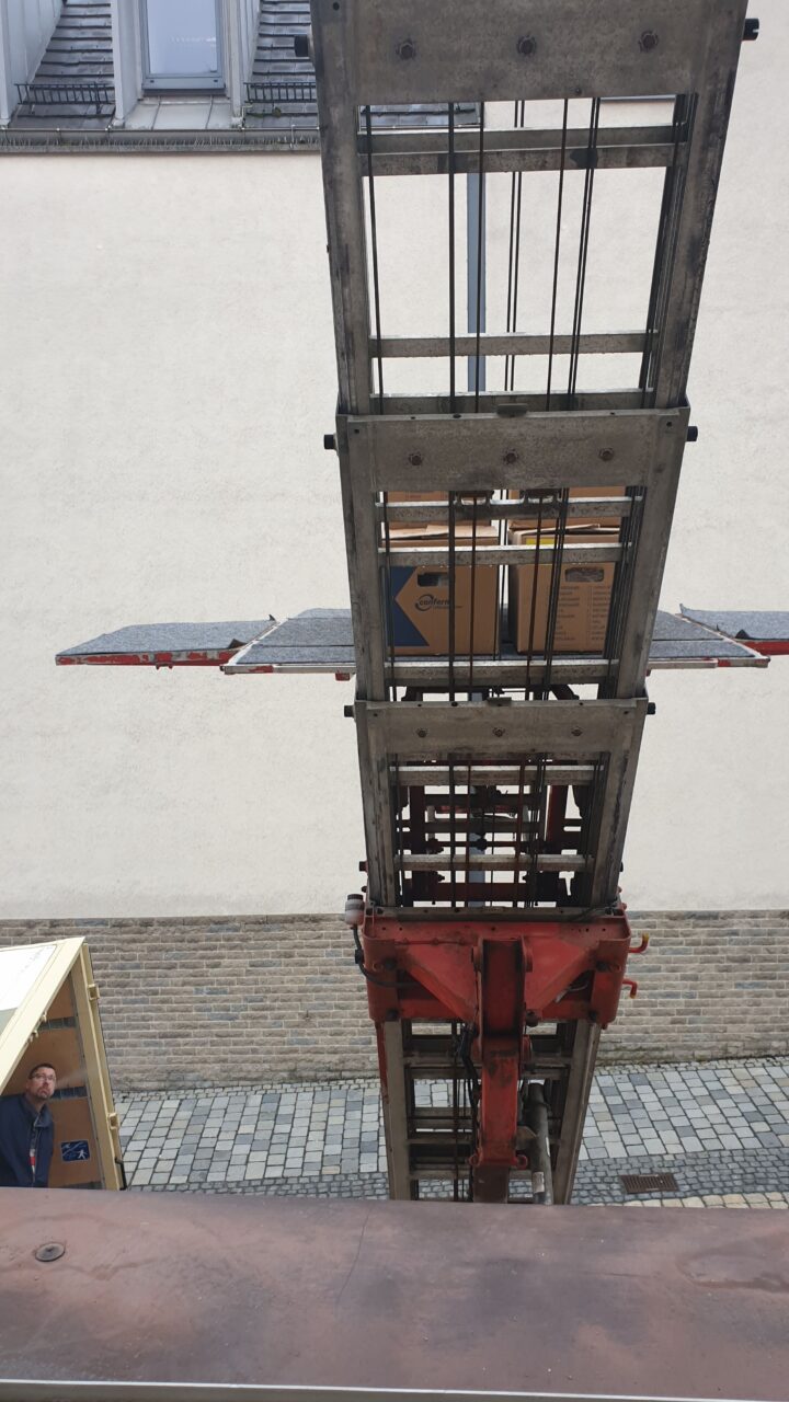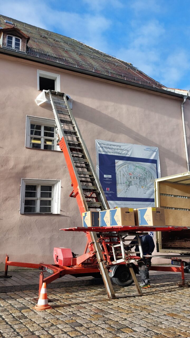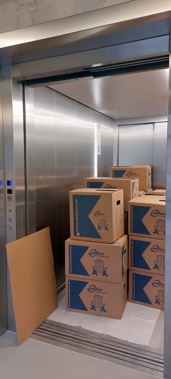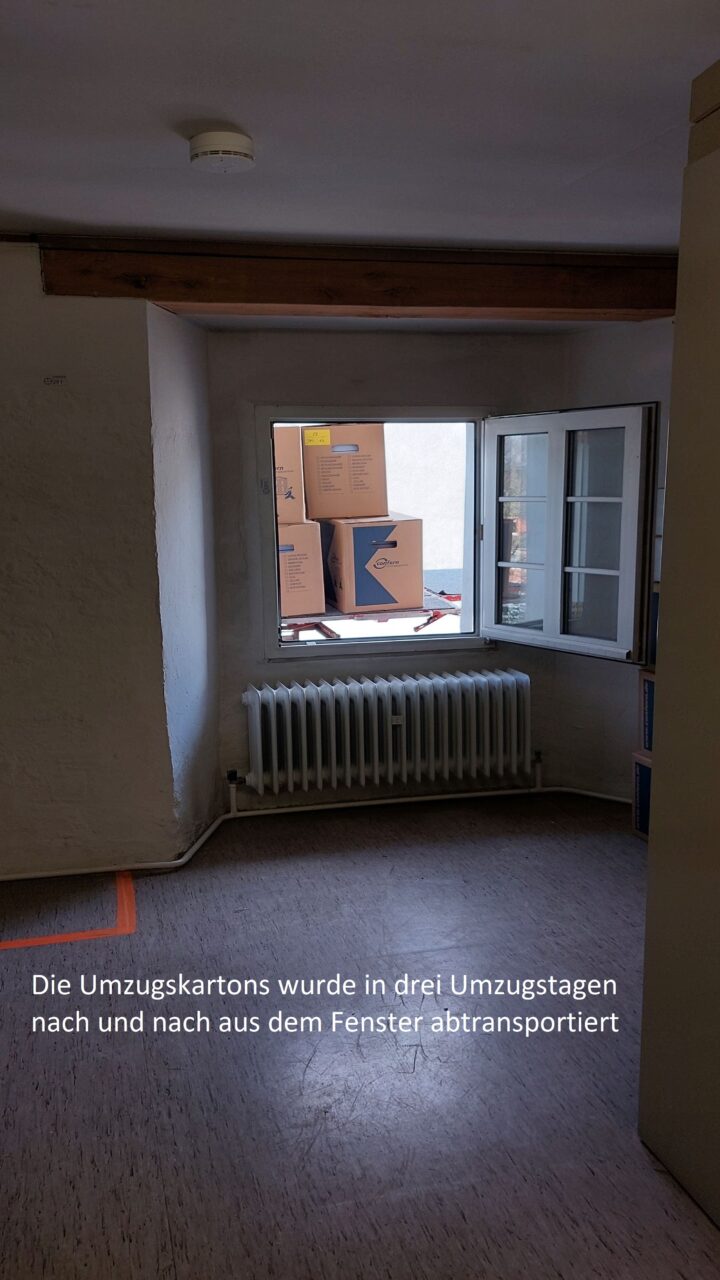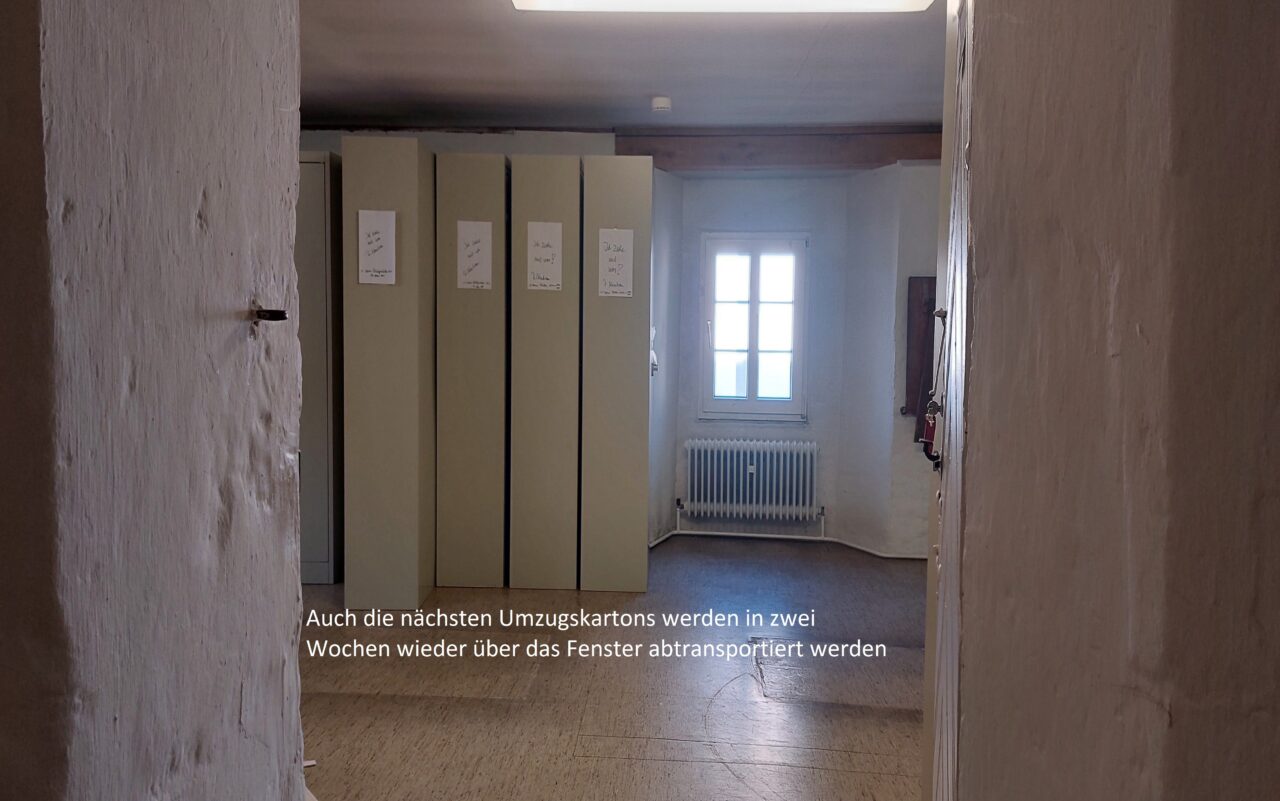 Das Gebäude an sich ist und bleibt jedoch unsere größte Herausforderung. Die Planungen des eigentlichen Umzugs und weiterer Lieferungen schreiten voran, immer mit dem Wissen, dass alles händisch über die historische Treppe oder Fenster hinausgetragen werden muss.