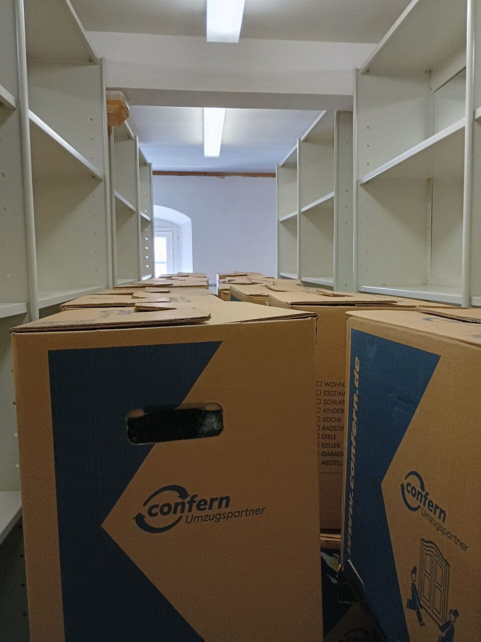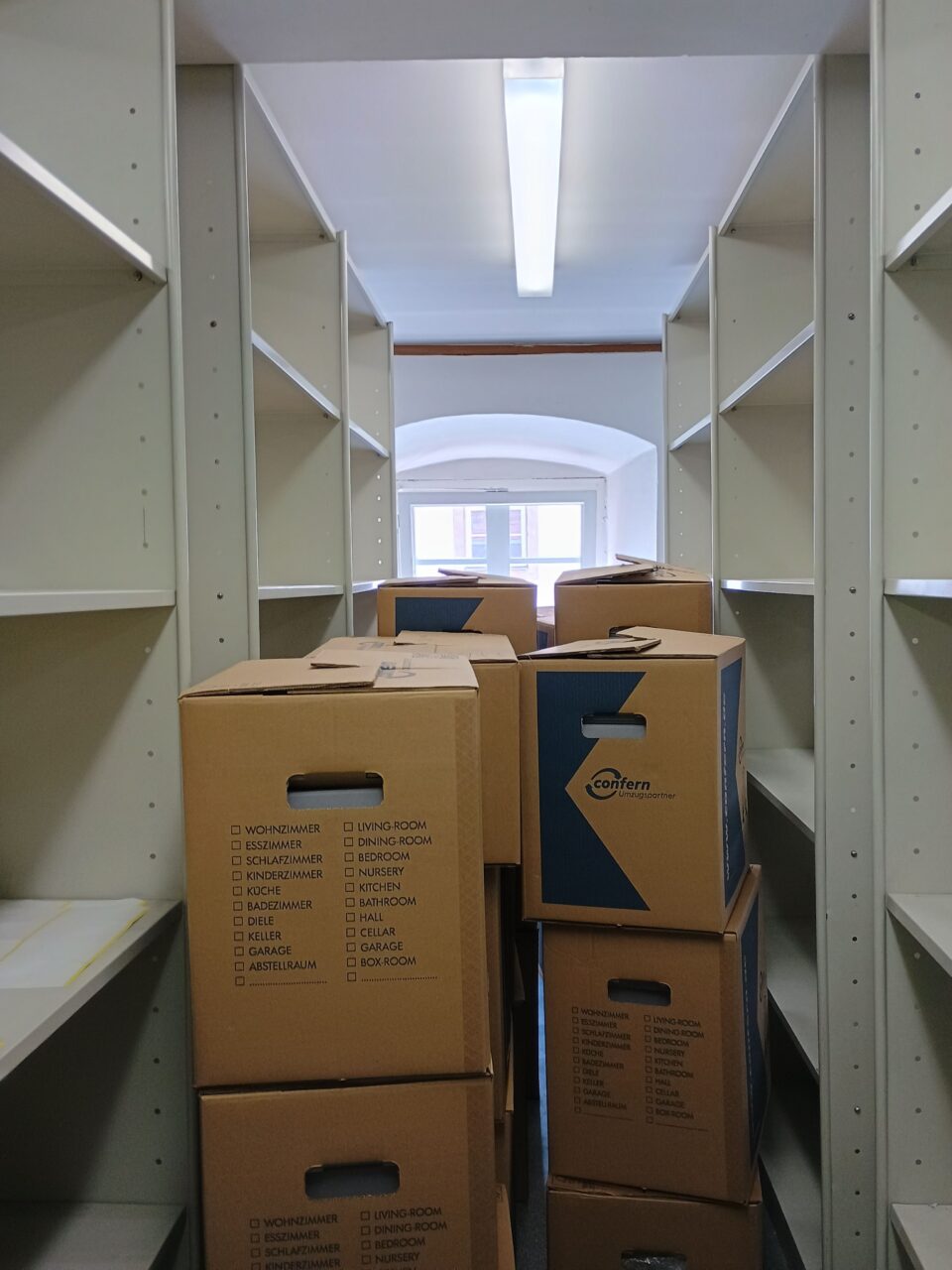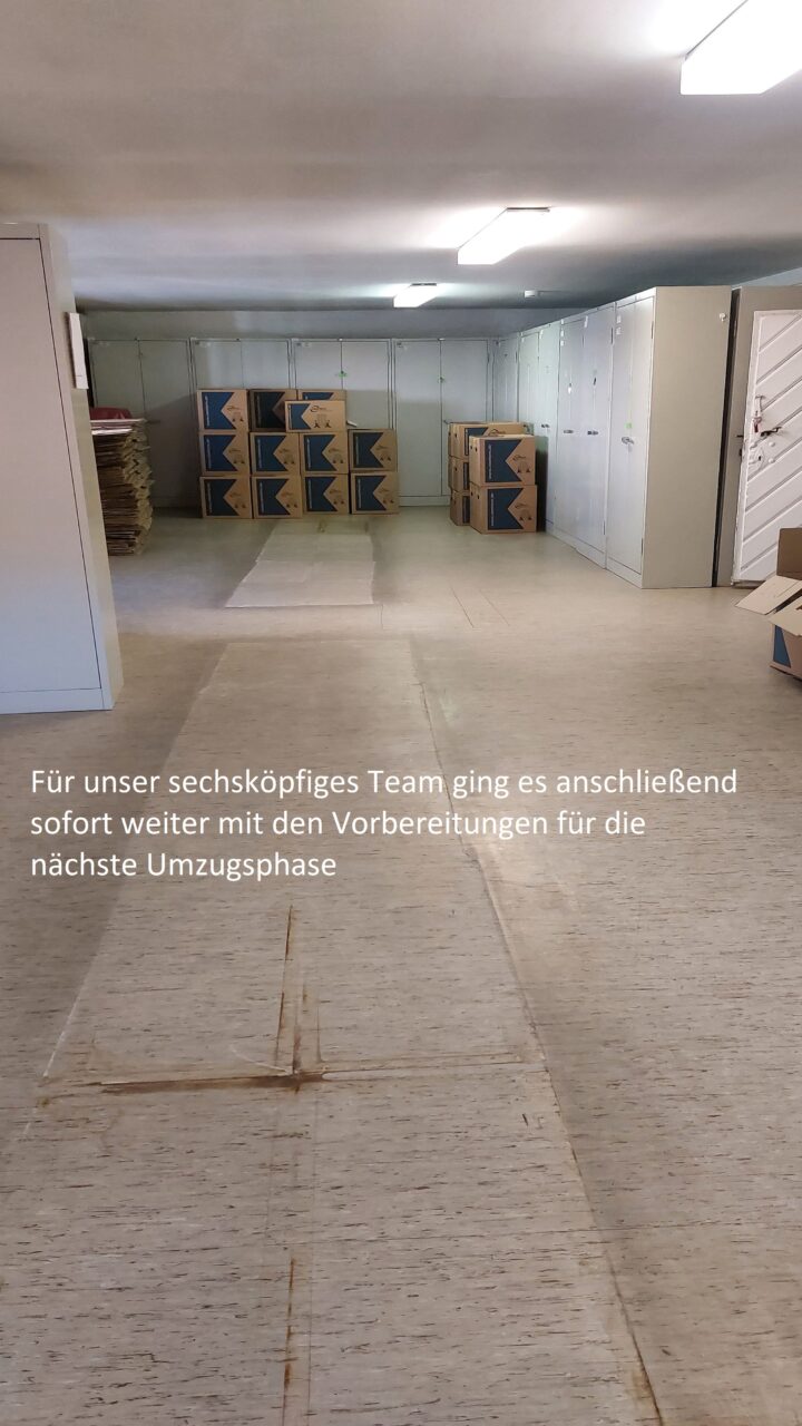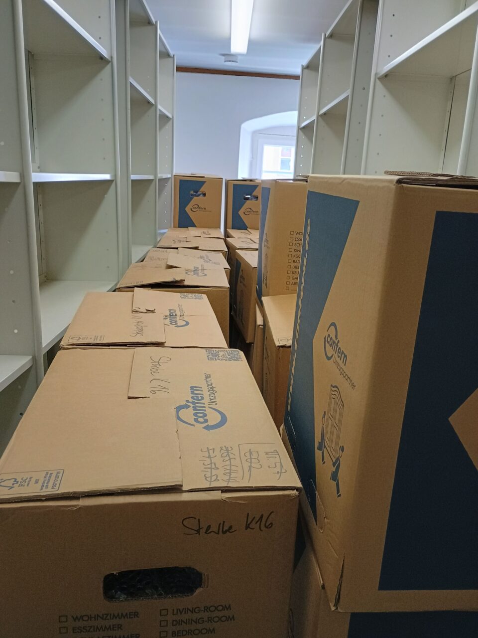 In den letzten zwei Wochen haben wir alles gegeben und konnten alle drei Magazinräume im ehemaligen Archiv leerräumen. Dazu packten wir am Tag hunderte Umzugskartons, ließen sie in das neuen Archiv transportieren und packten diese so schnell wie möglich aus, um neuen Platz zu schaffen. Tausende Archivboxen gingen durch die Hände unseres sechsköpfigen Teams und unserer Helfer.