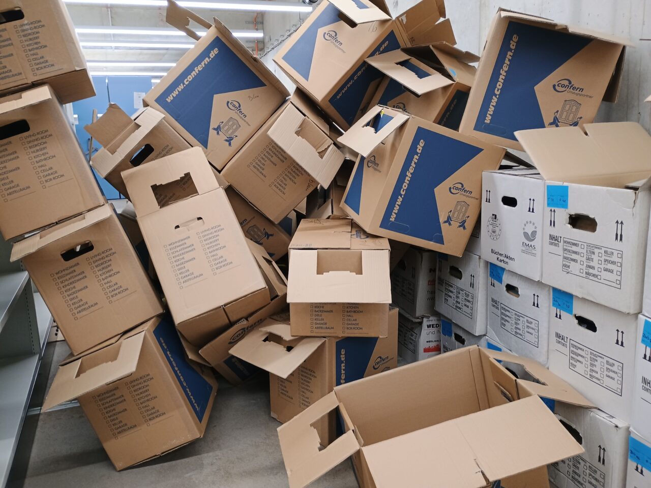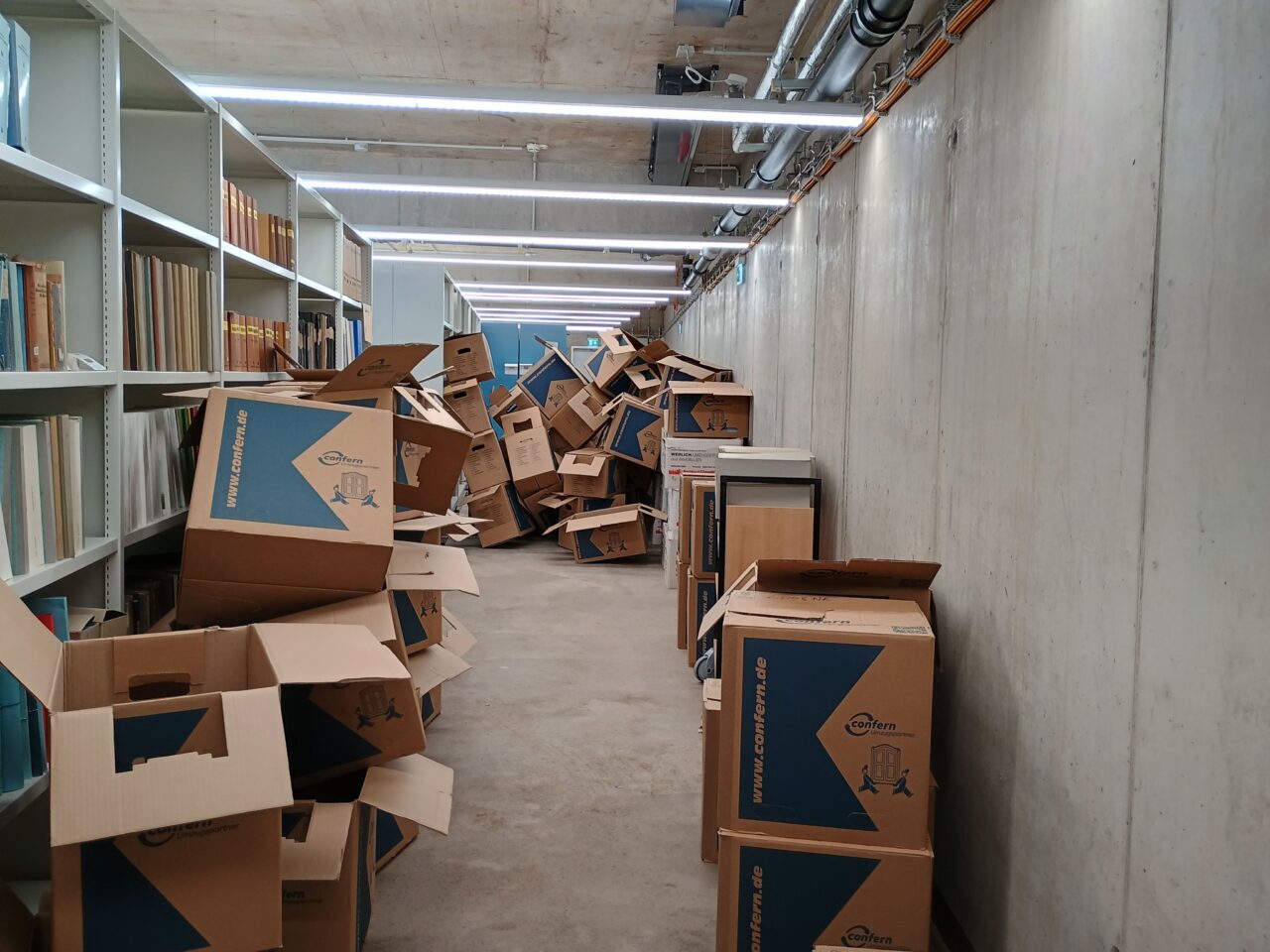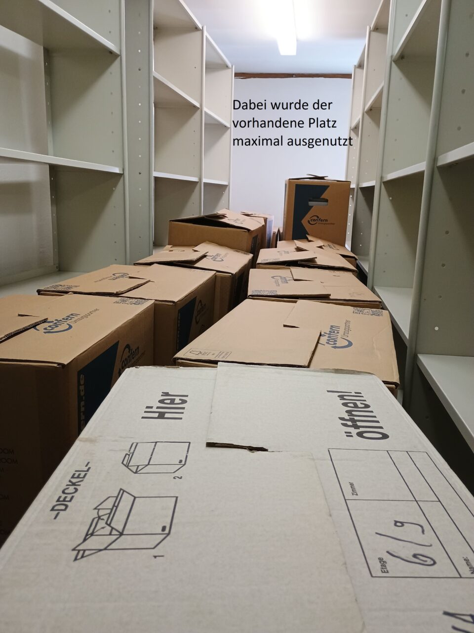 In den letzten zwei Wochen haben wir alles gegeben und konnten alle drei Magazinräume im ehemaligen Archiv leerräumen. Dazu packten wir am Tag hunderte Umzugskartons, ließen sie in das neuen Archiv transportieren und packten diese so schnell wie möglich aus, um neuen Platz zu schaffen. Tausende Archivboxen gingen durch die Hände unseres sechsköpfigen Teams und unserer Helfer.