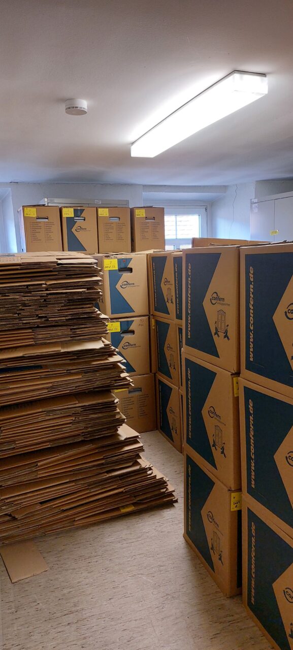 In dieser Woche wurden knapp 4.000 Archivboxen angeliefert. Diese werden dringend zur vorbereitenden Verpackung des Archivguts benötigt. Eine Lieferung in diesem Umfang gab es bisher aus Platzgründen noch nicht.