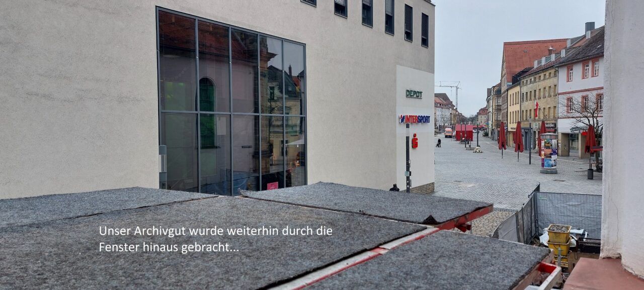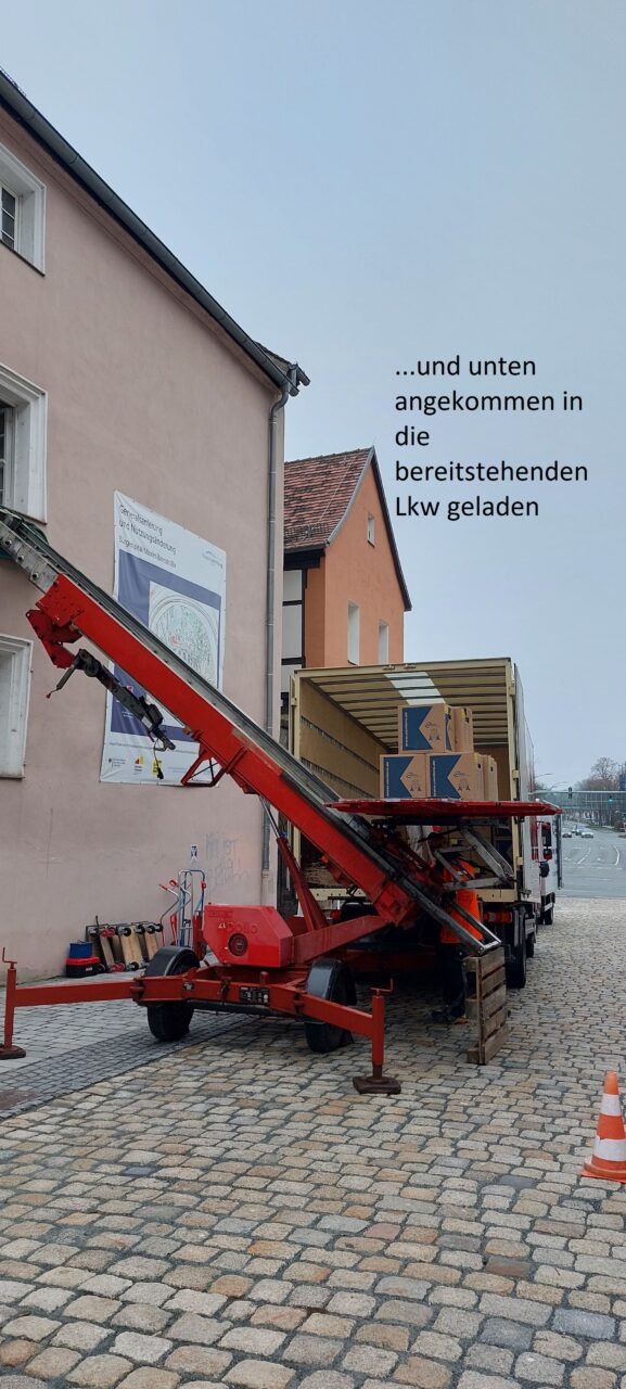 In der Woche vom 23.02. bis 28.02. setzten wir unseren Umzug in den Neubau fort. Die bereits gepackten Umzugskartons im 2. OG des ehemaligen Stadtarchivs wurden über einen Außenaufzug durch das Fenster hinaus transportiert. Anschließend wurde das Archivgut mit dem bereitstehenden LKW zum Neubau gebracht und dort sofort ausgeladen. Aufgrund der enormen Masse musste das Archivgut sofort verräumt werden, da sonst die Gänge und die Rollregalanlage in den Magazinen blockiert worden wäre. Anschließend wurde das Verpackungsmaterial zurück transportiert und neu befüllt. In 3 Umzugstagen wurden somit 5 LKW Ladungen in den Neubau transportiert und ausgeräumt. Am Sonntag, den 01.03. konnten wir zusätzlich einigen Besuchern einen Einblick in unsere bisherige Arbeit gewähren.