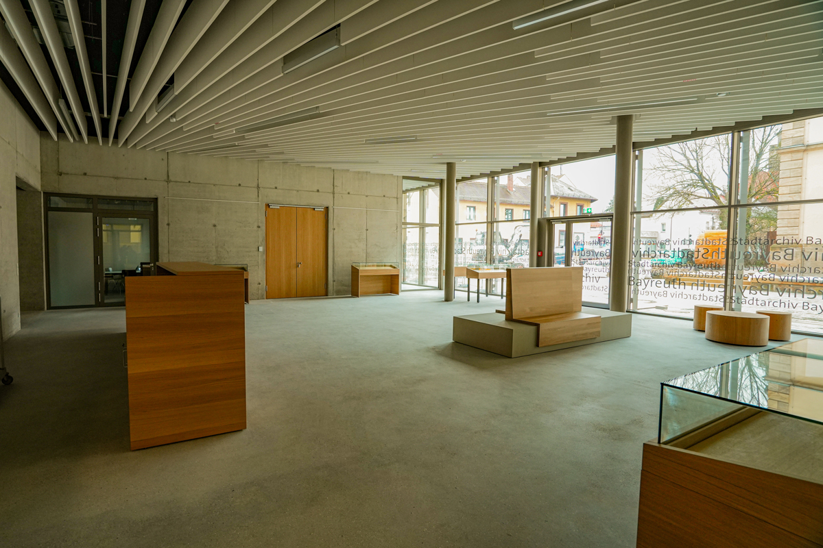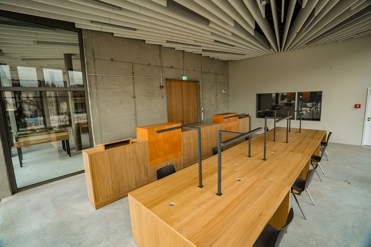 Planschränke mit einer Länge von über 35 laufenden Metern bieten Platz für Fotos und Filme. Darüber hinaus befinden sich im Neubau unter anderem ein lichtdurchfluteter Lesesaal und ein Foyer, in dem künftig Veranstaltungen stattfinden sollen.